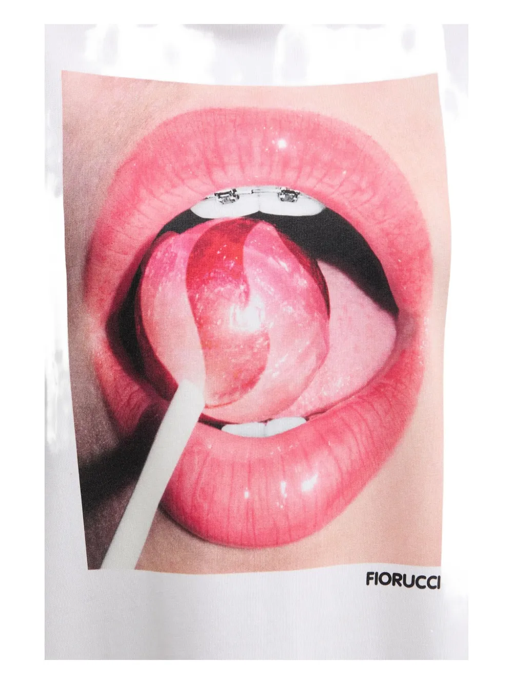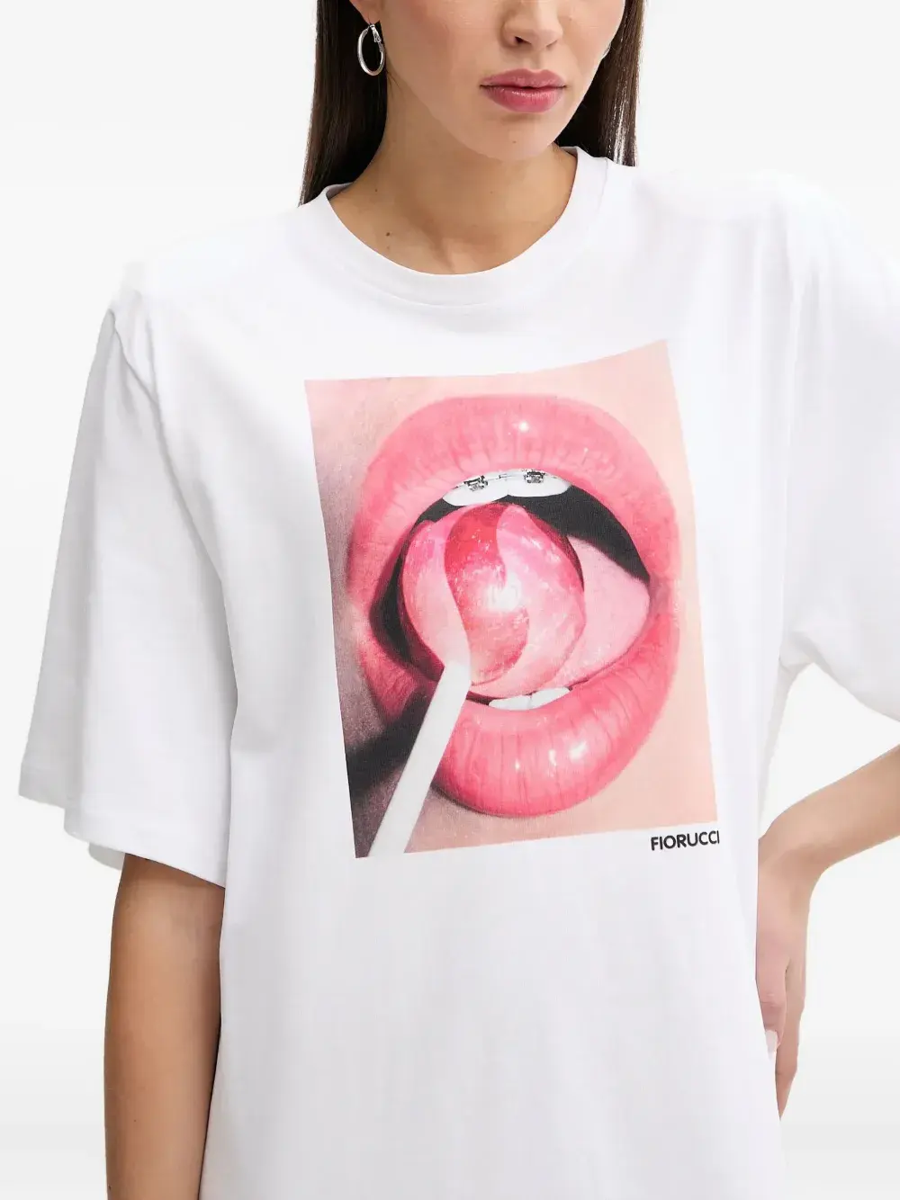 Белые короткие рукава, рисунок в виде губ, рисунок в виде леденцов, круглый вырез
