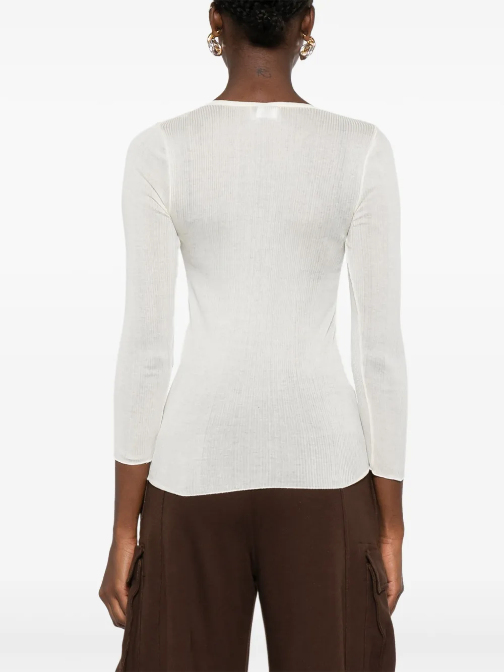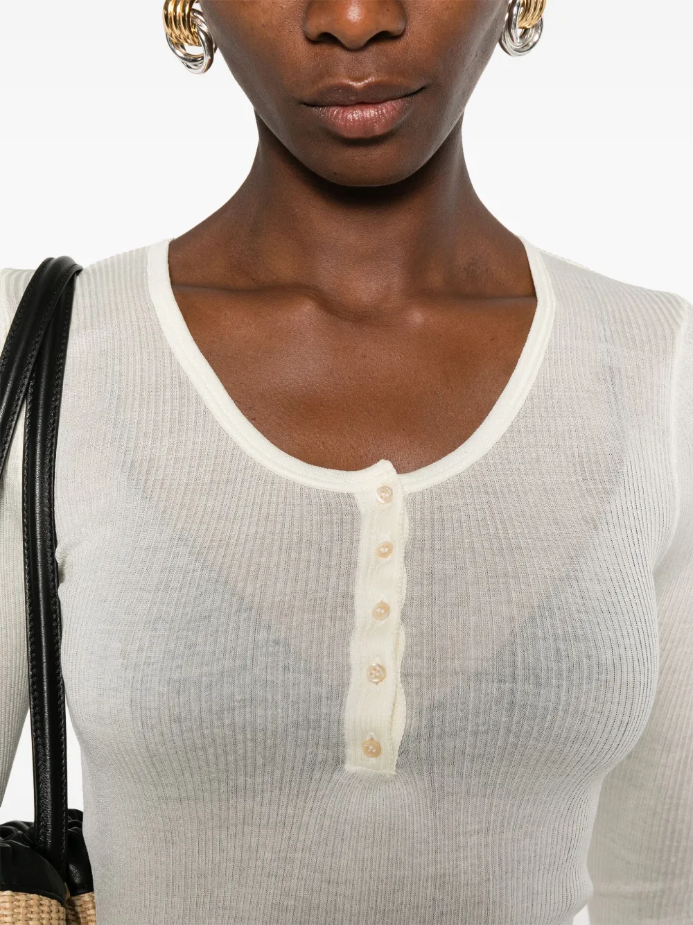 Белая ребристая текстура, круглый вырез, длинные рукава, планка с пуговицами