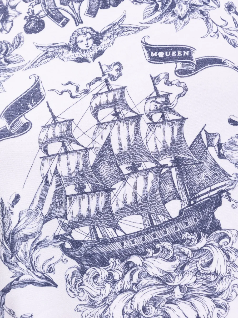 Белый графический дизайн корабля, цветочные украшения, круглый вырез горловины, короткие рукава