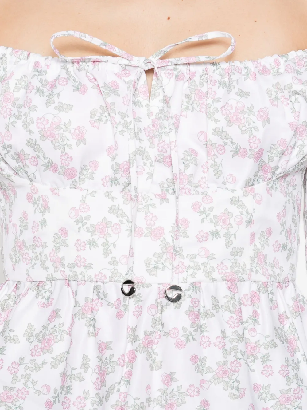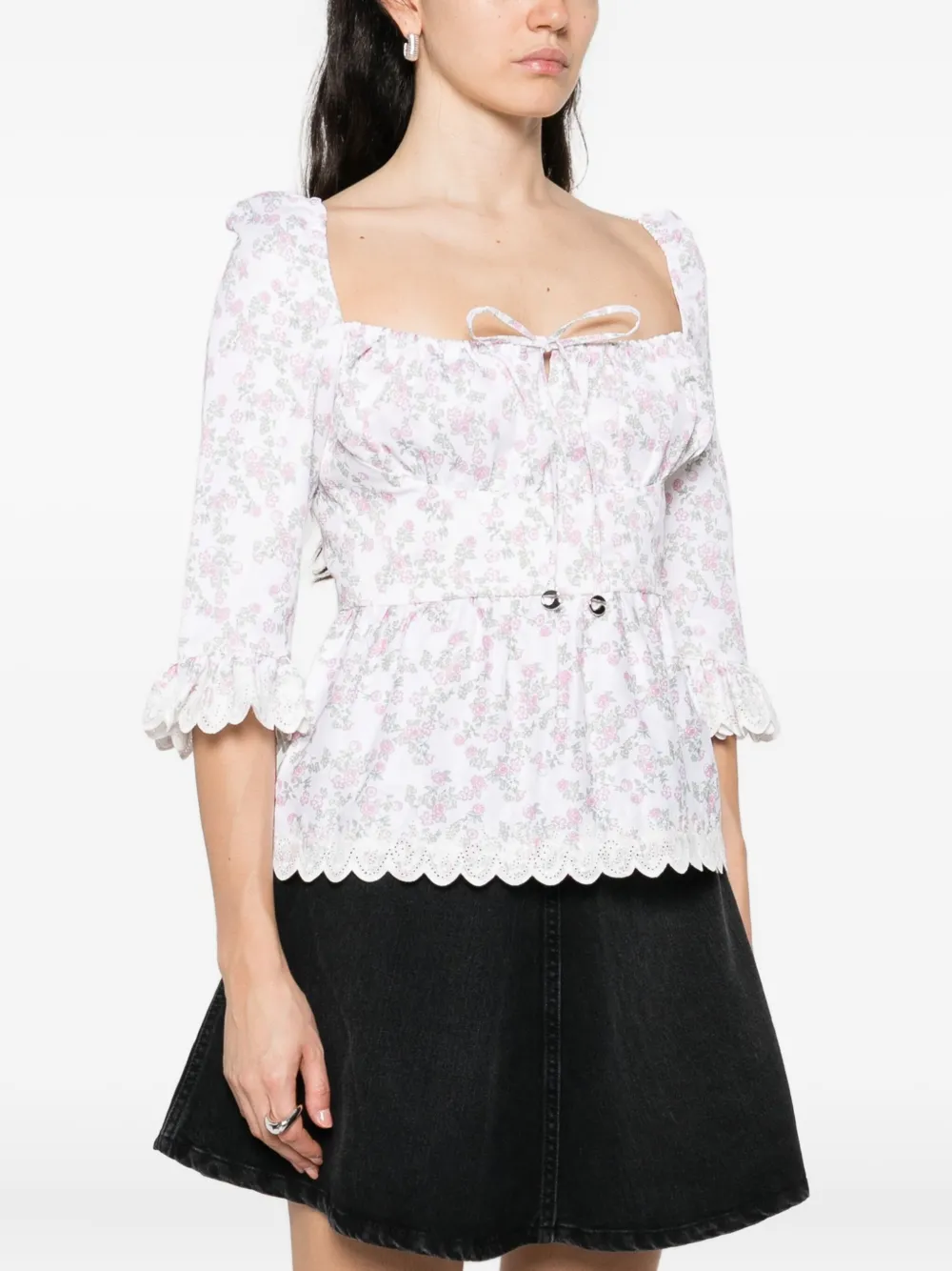 Белый цветочный принт, оборки, рукава три четверти, шнуровка, фестончатый подол