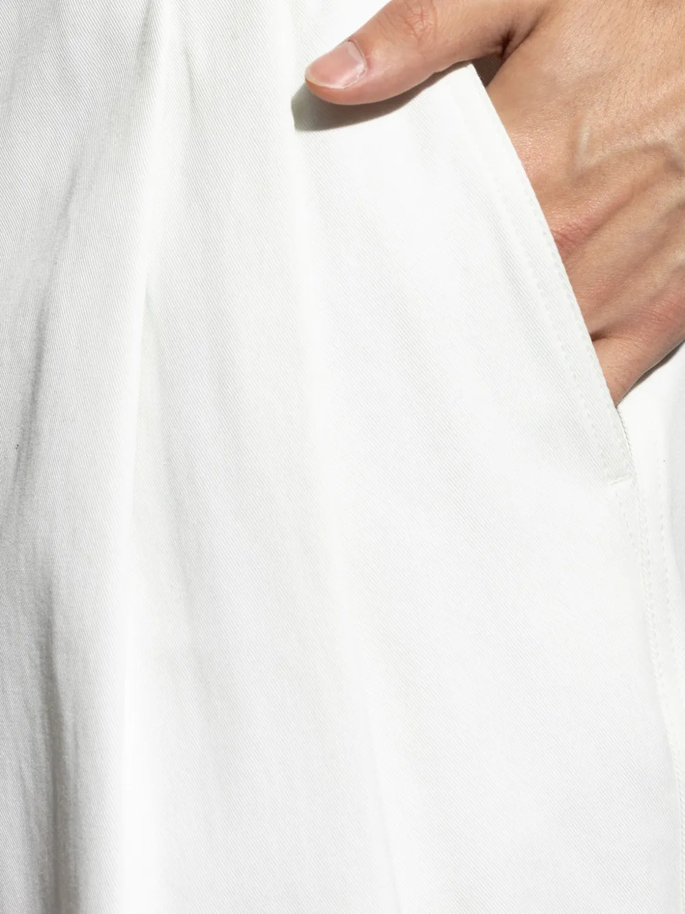 Складки цвета слоновой кости спереди сзади, накладной карман, вышитый логотип на пуговицах, прямой подол