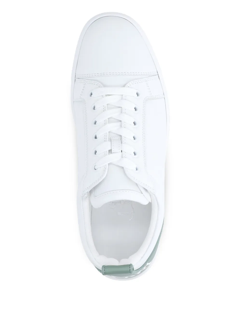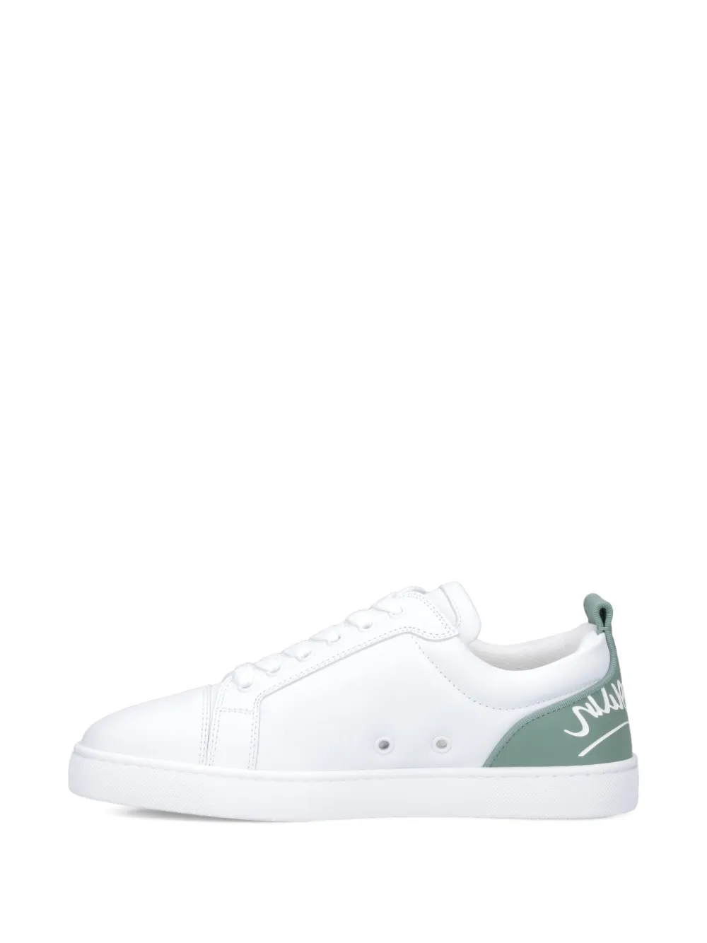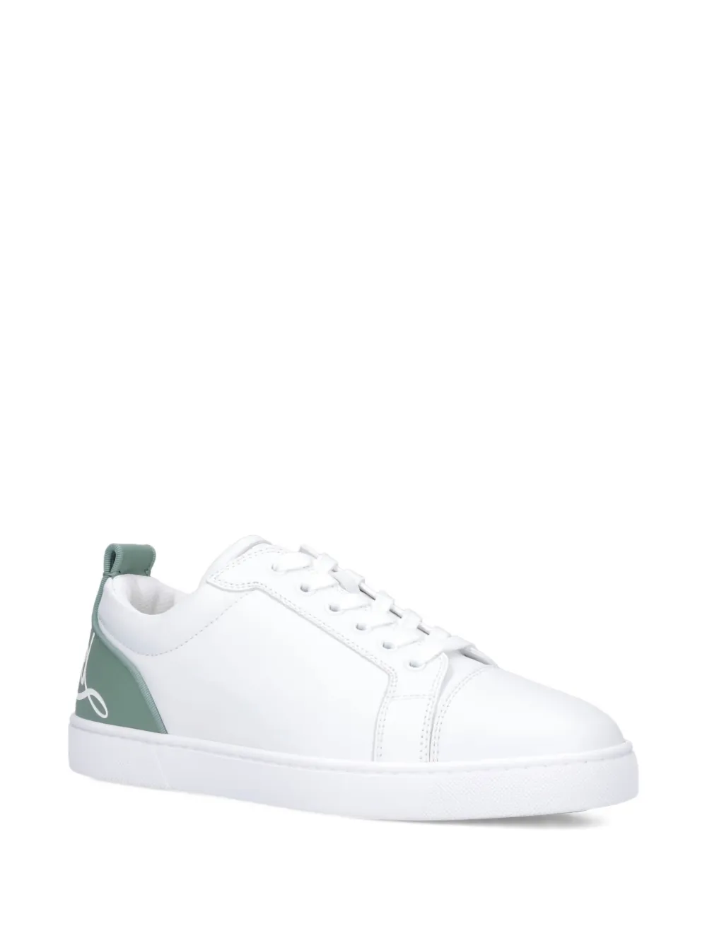 Верх из белой кожи, фирменная надпись Louboutin, панельный дизайн, шнуровка, плоская подошва