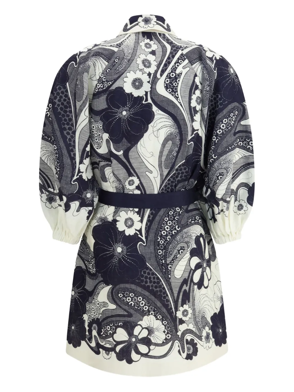 Платье-рубашка с белым цветочным принтом, рукавами-буфами, воротником-стойкой и завязывающимся поясом