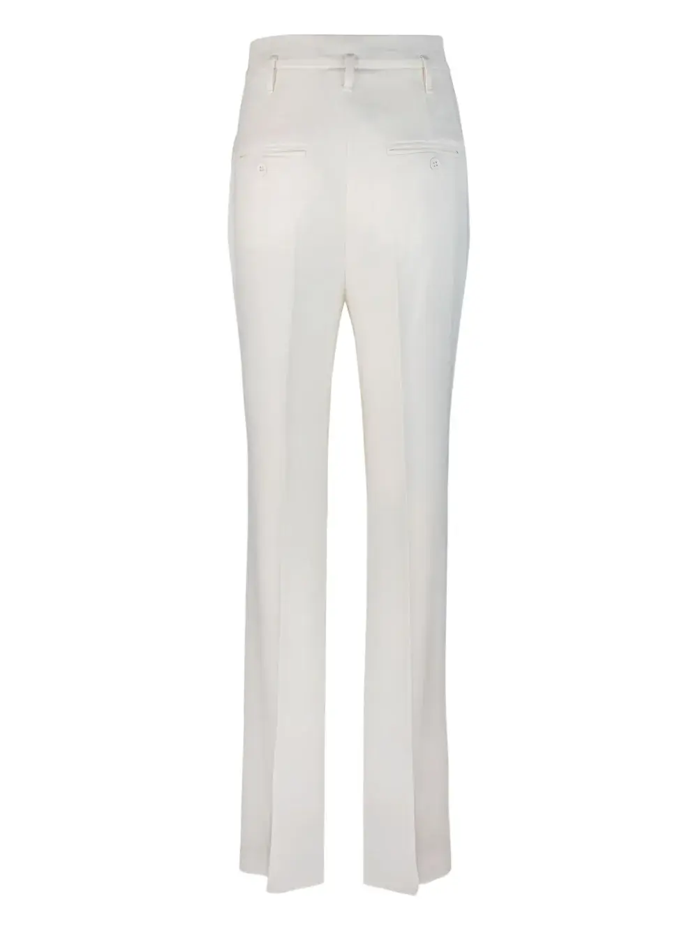 Складки белого цвета спереди, застежка на крючок и планку, передние карманы, застегивающиеся на пуговицы задние карманы
