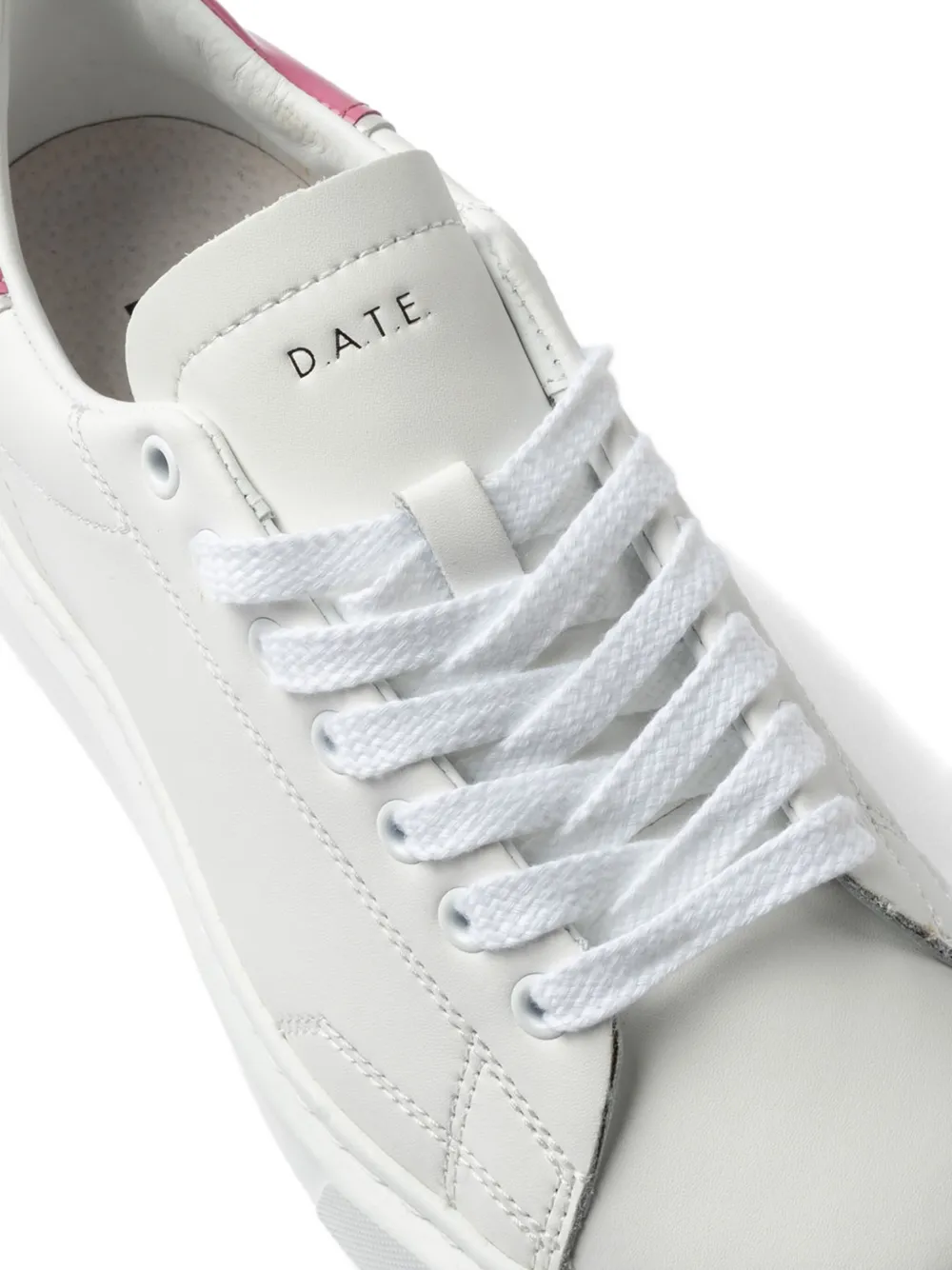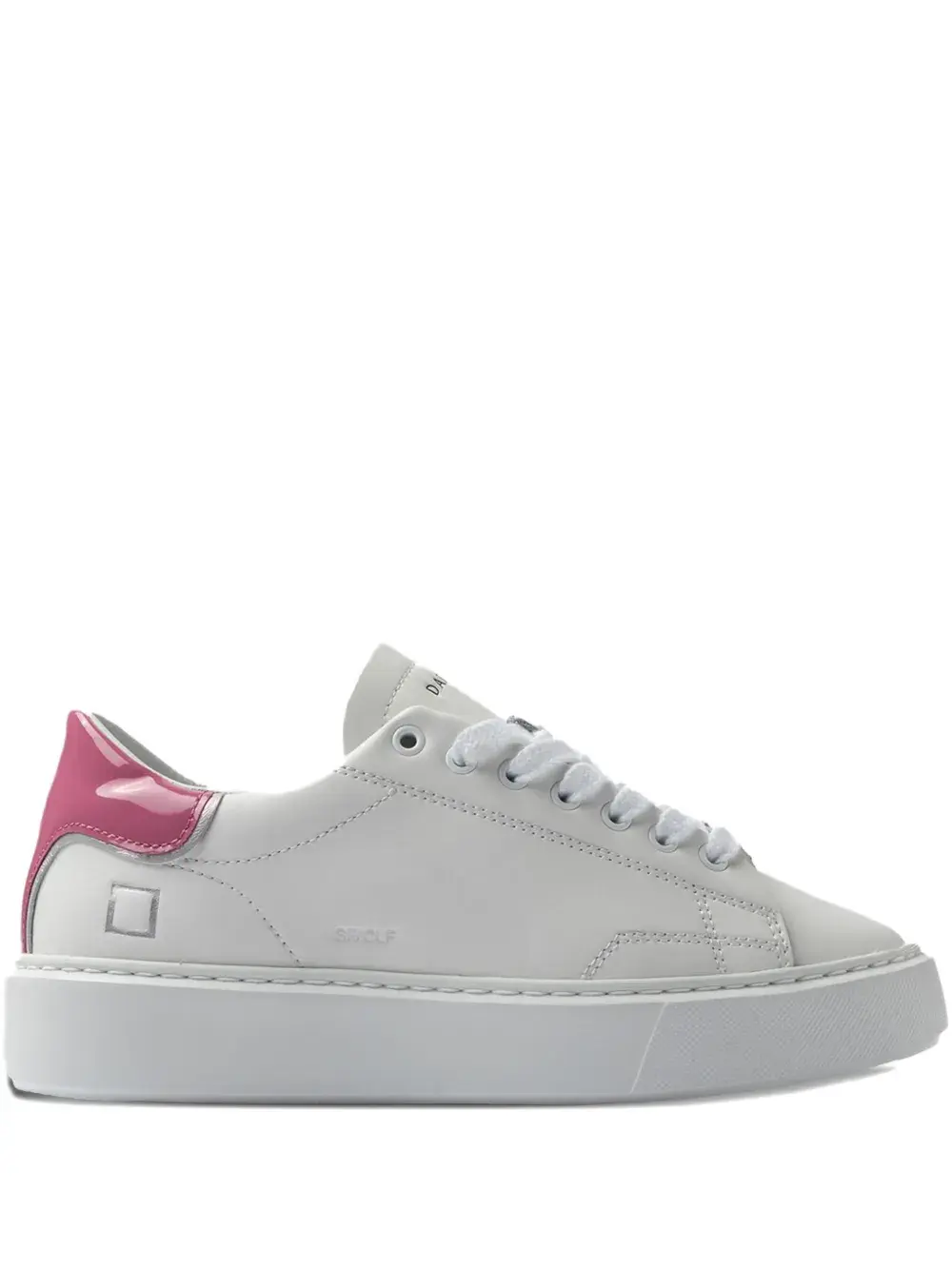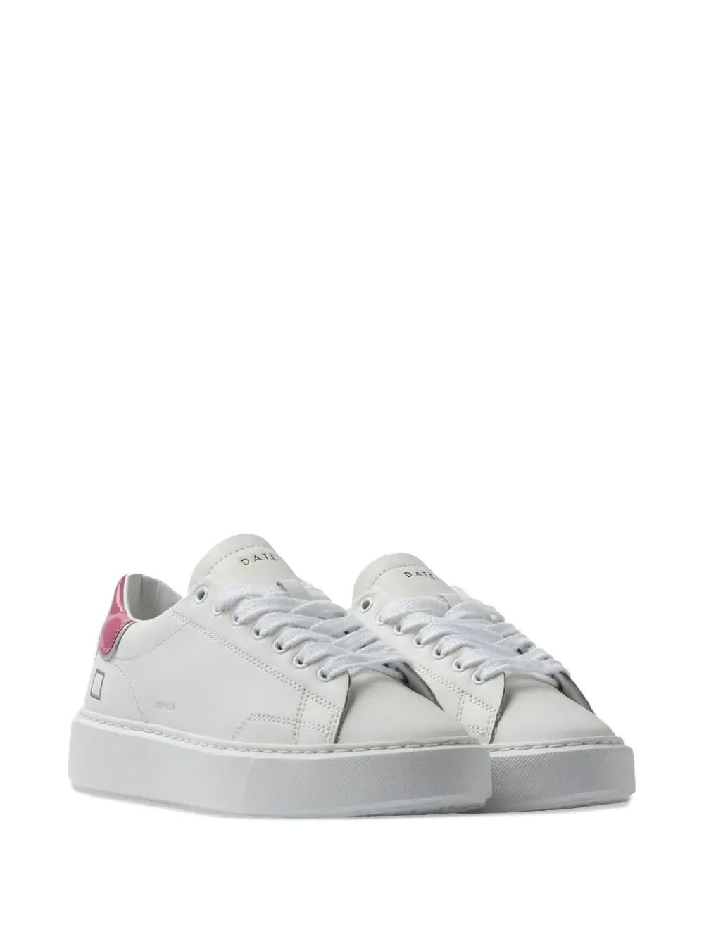 Верх из белой и фуксиевой кожи, нашивка сзади из лакированной кожи цвета фуксии