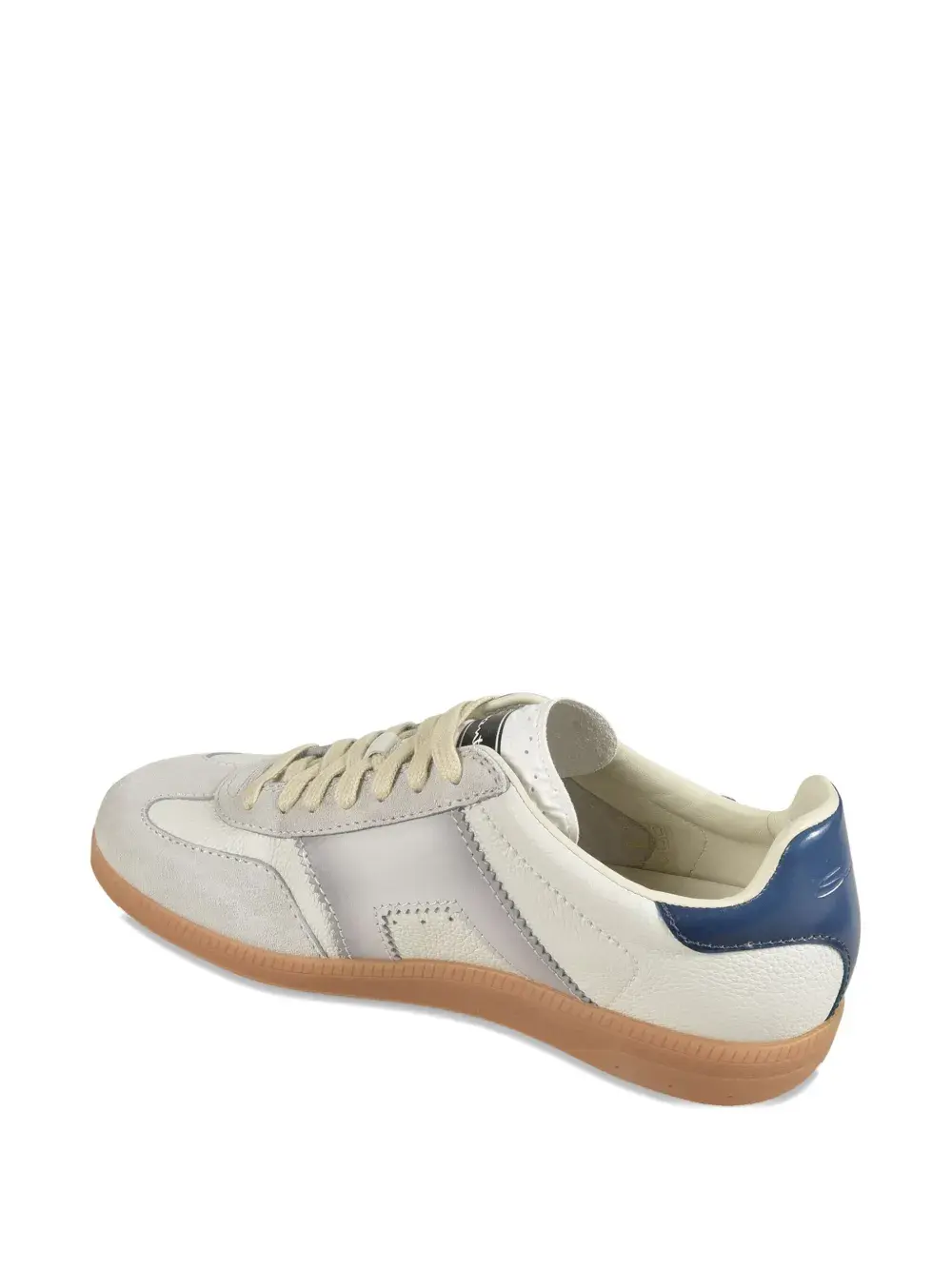 Верх из белой кожи, замшевая вставка на пятке, тональные шнурки, резиновая подошва, темно-синяя накладка на пятке