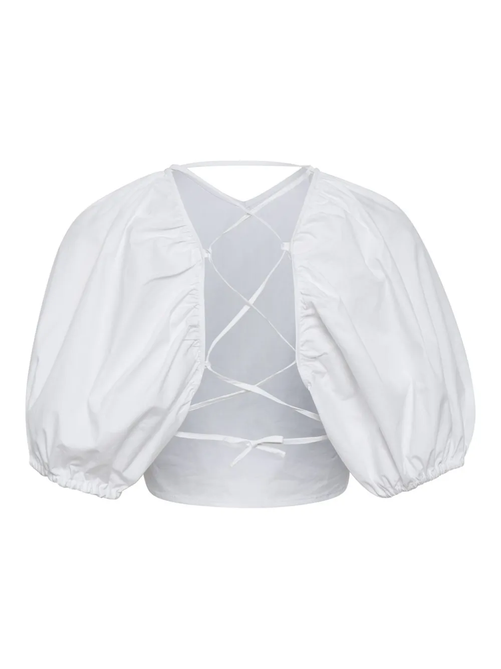 Ярко-белая хлопковая модель с рукавами-фонариками, шнуровкой на спине, укороченным круглым вырезом