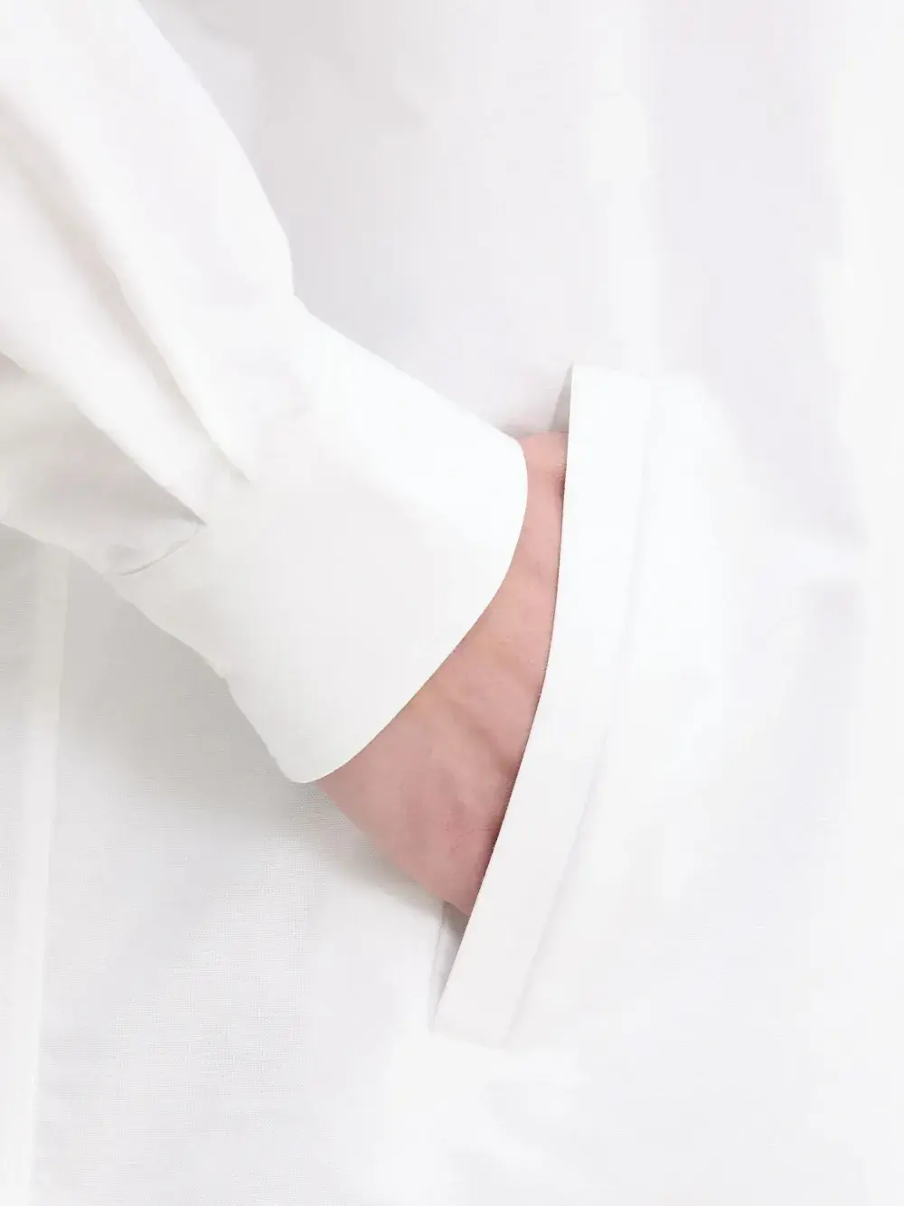 Белая застежка на пуговицы спереди, длинные рукава, застегивающиеся на пуговицы манжеты, прямой подол