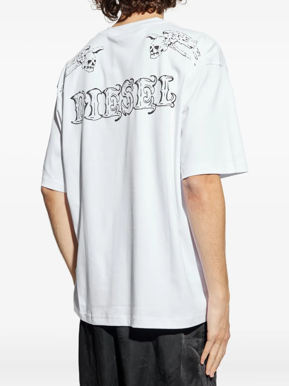 Белый принт с черепом, короткие рукава, круглый вырез горловины, логотип и этикетка