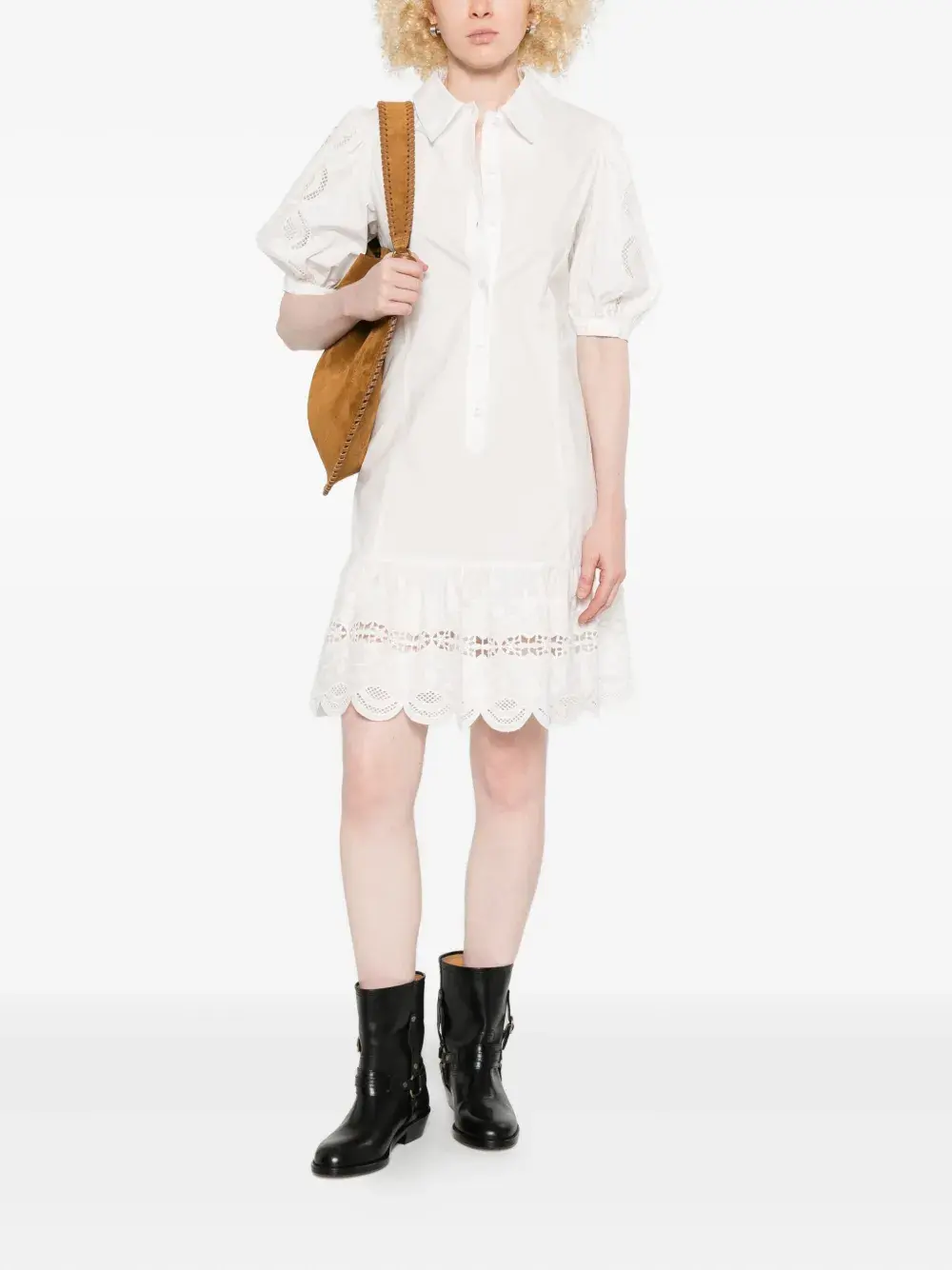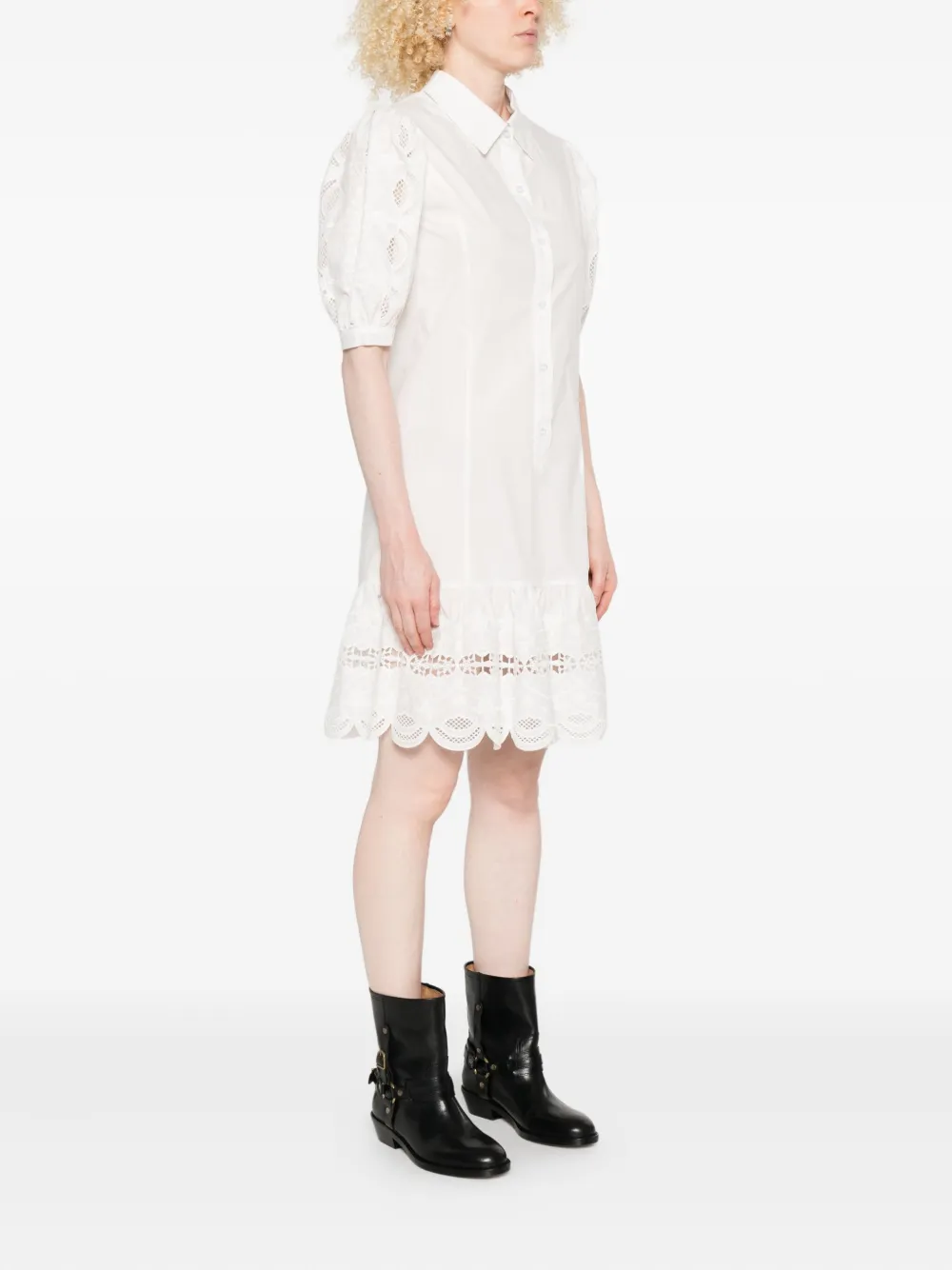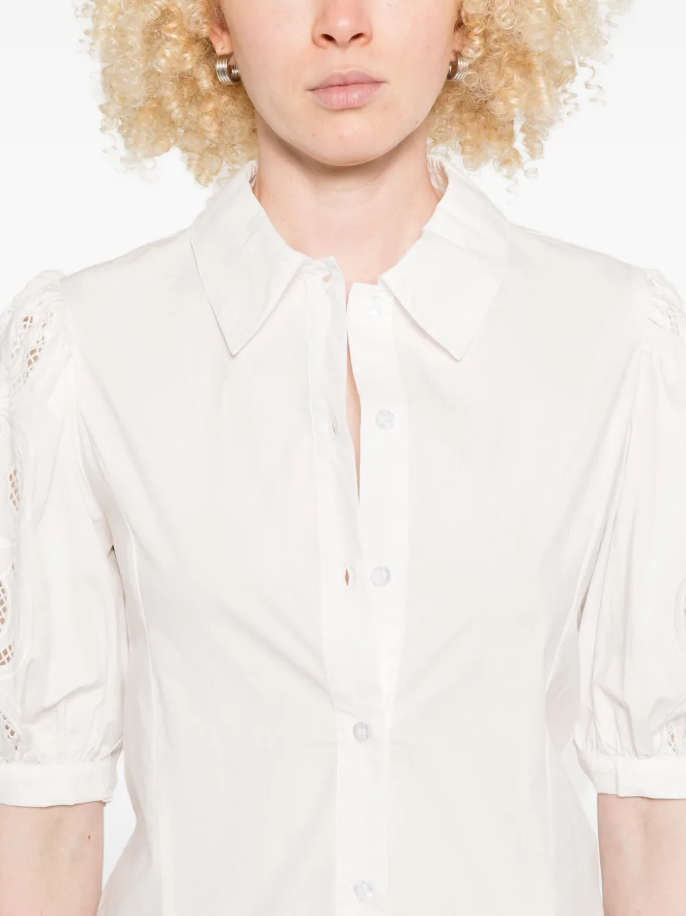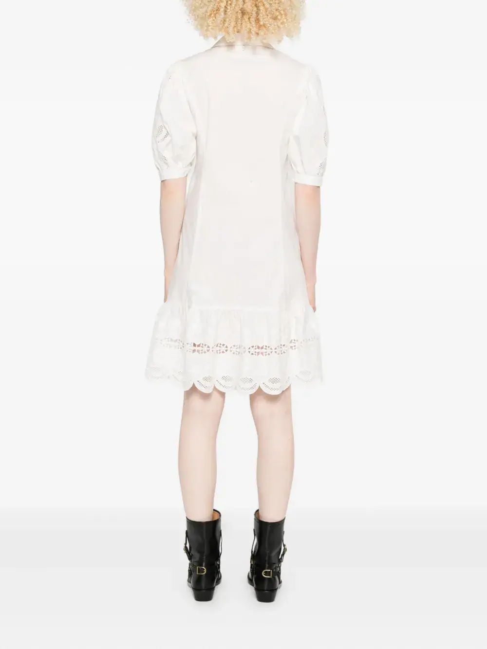 Белая ажурная отделка, фестончатый край, застежка на пуговицы, воротник-стойка
