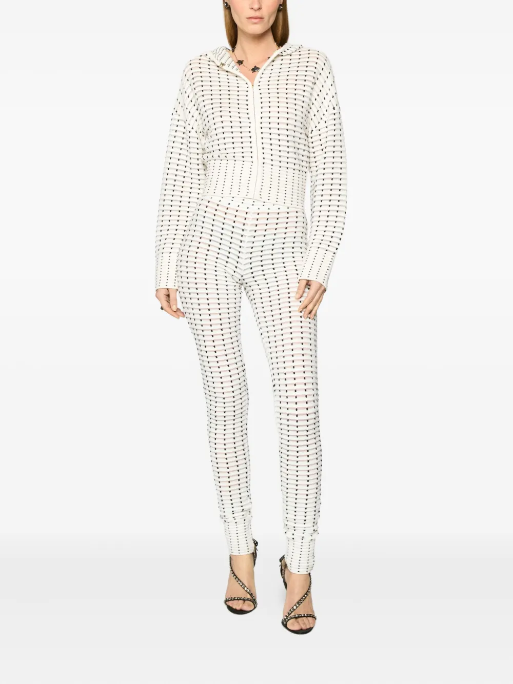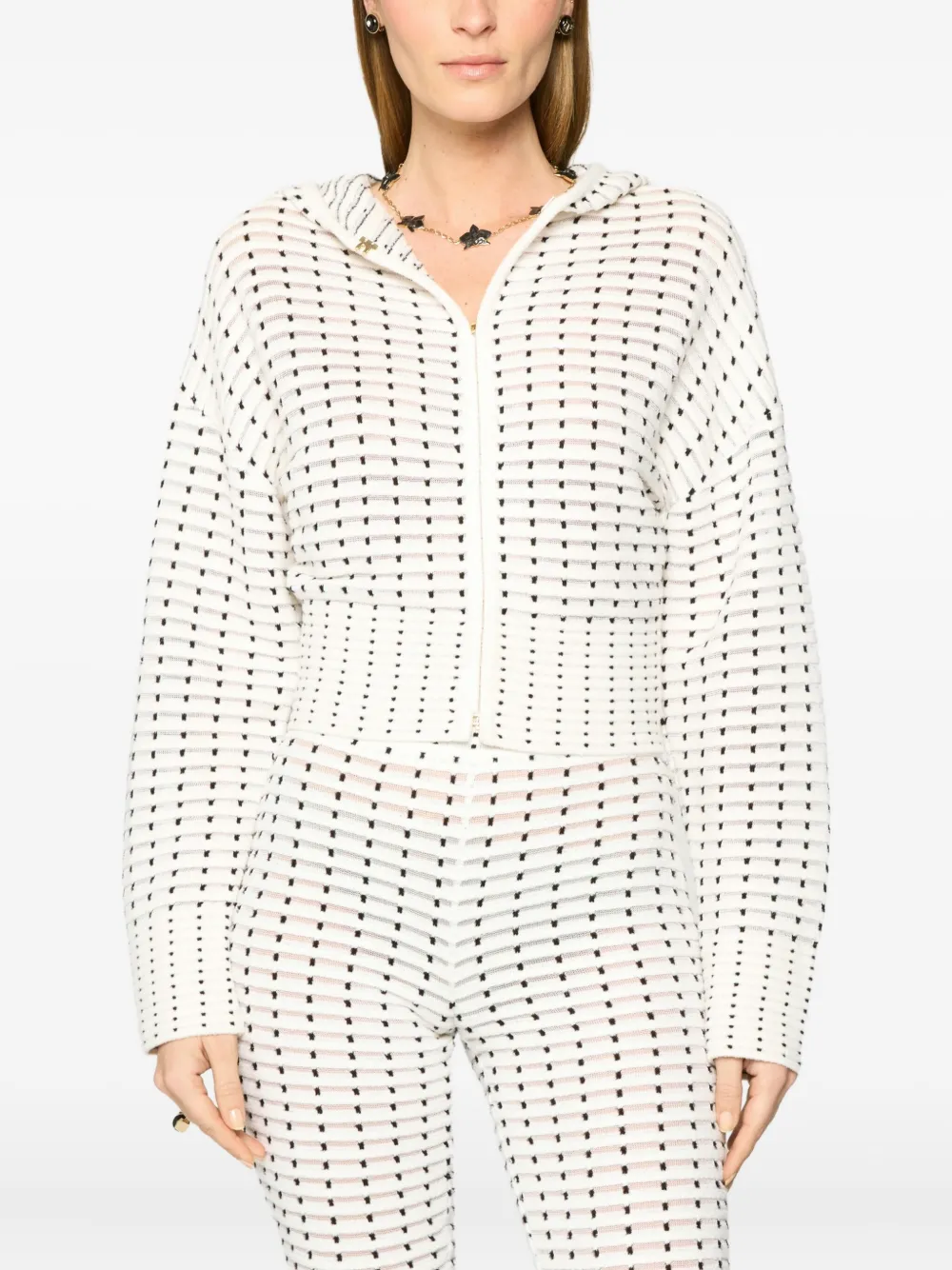 Белый геометрический узор, застежка на крючок и петельку, капюшон, длинные рукава, ребристые манжеты