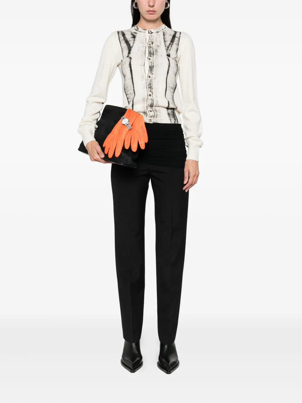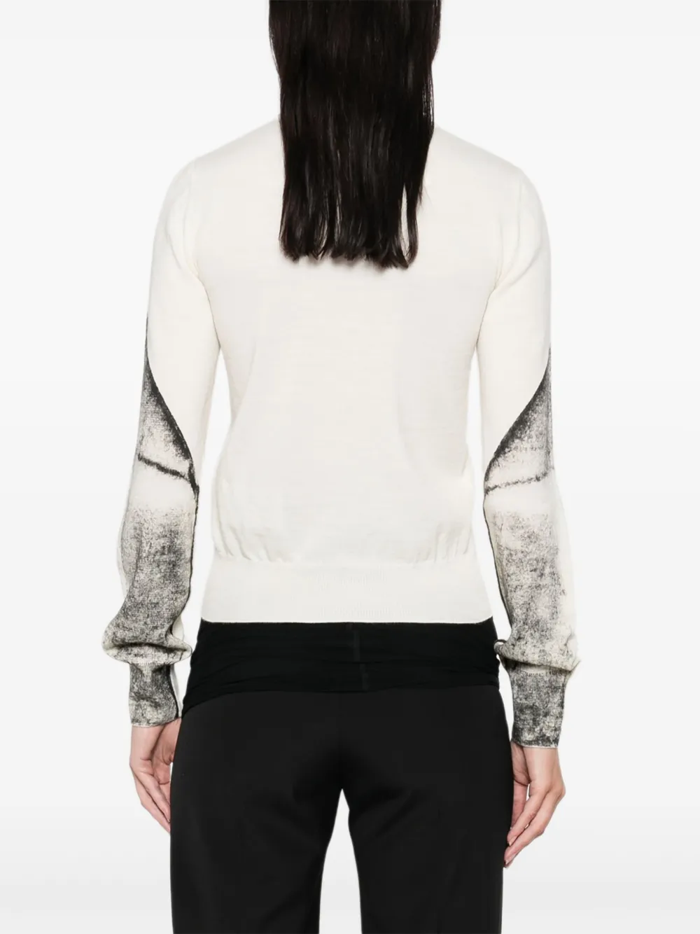 Белый абстрактный принт, длинные рукава, ребристая отделка, шерстяная смесь