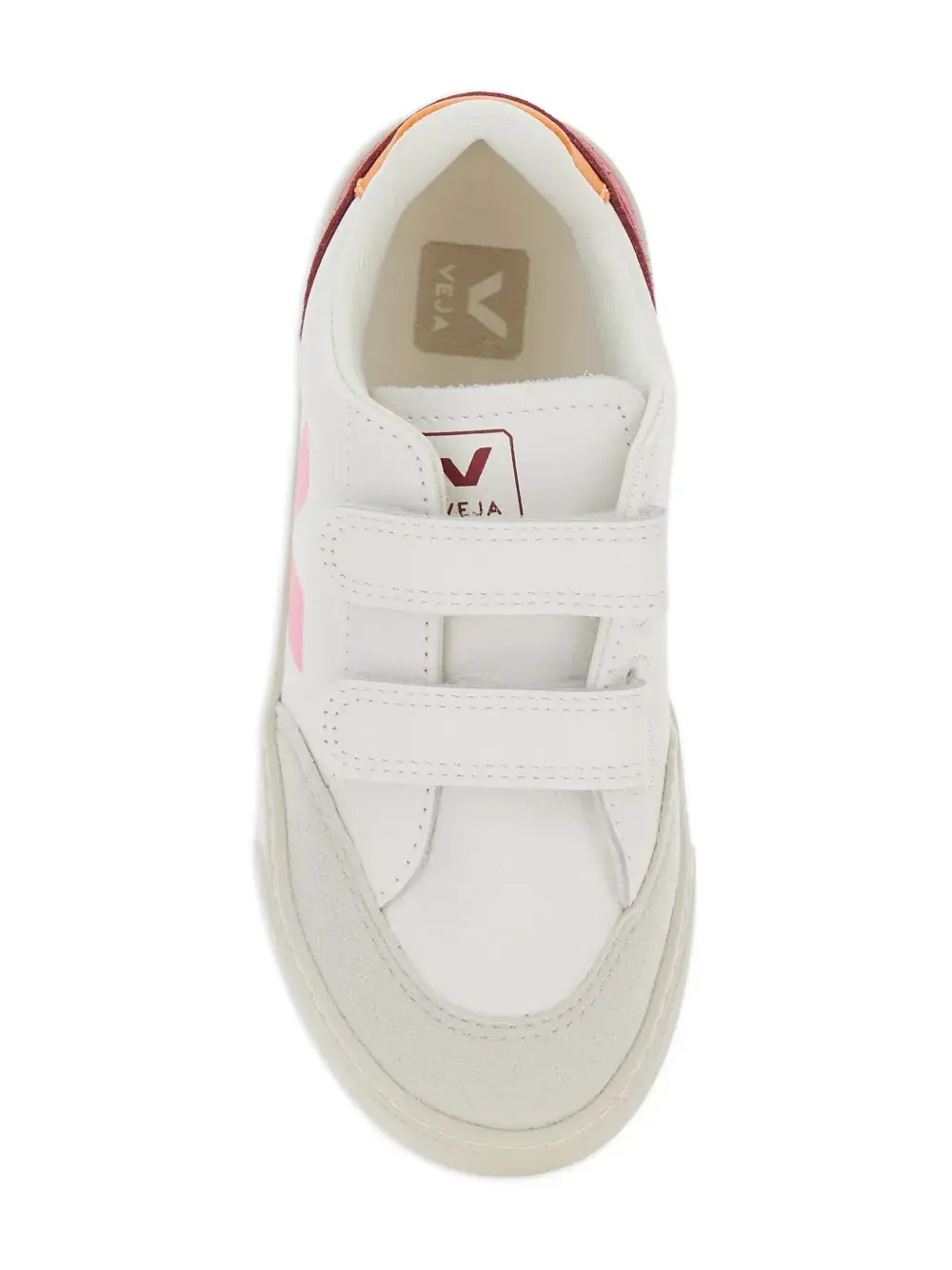 Верх из белой кожи, замшевая вставка на пятке, розовый логотип V, подошва белого цвета