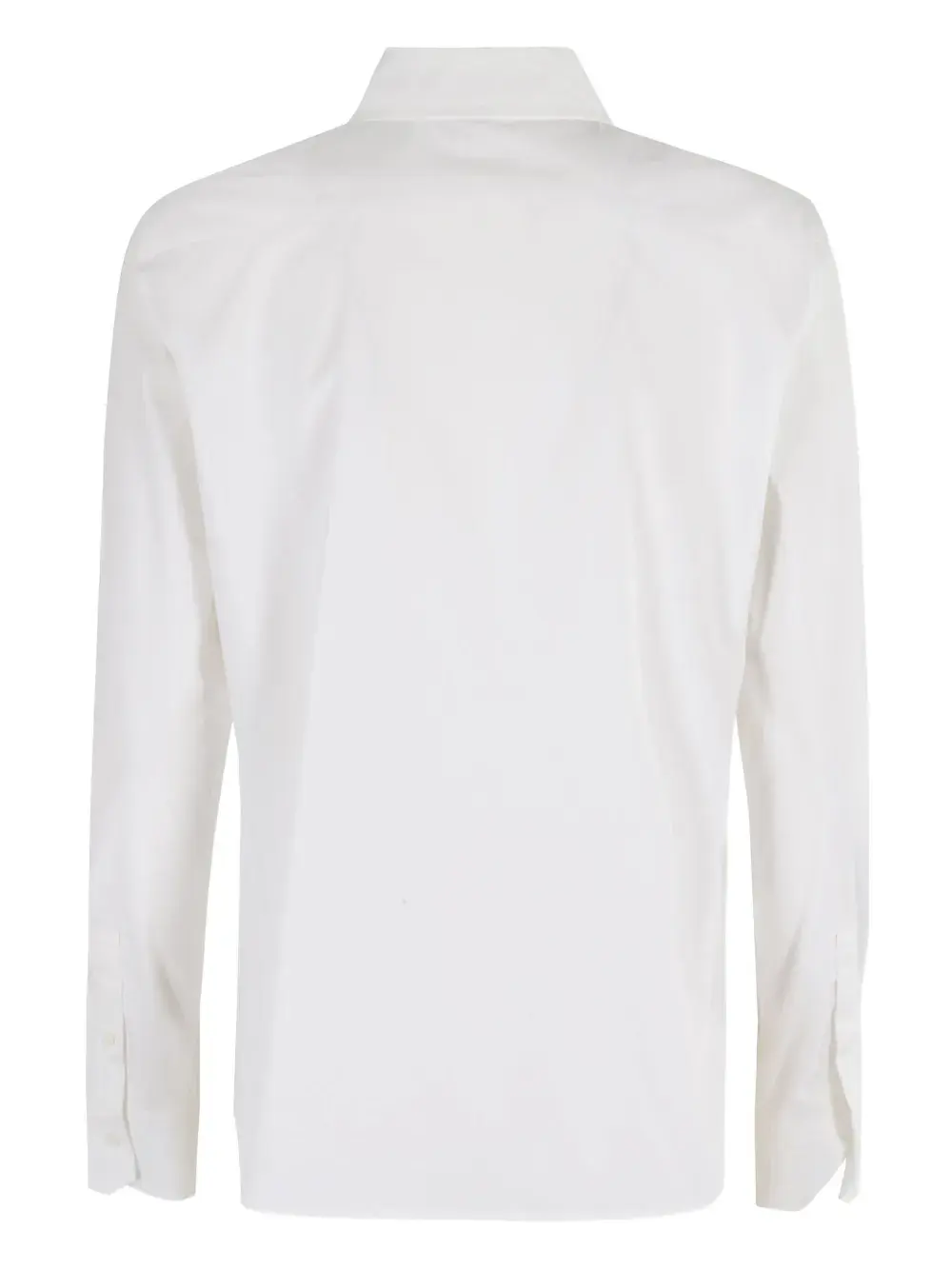 Белые длинные рукава, застежка на пуговицы, воротник, прямой подол