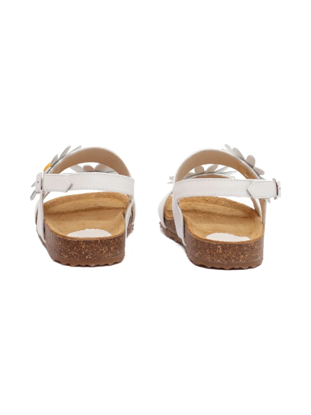 Верх из белой кожи, декор в виде ромашек, ремешок на щиколотке, застежка на пряжке, пробковая подошва