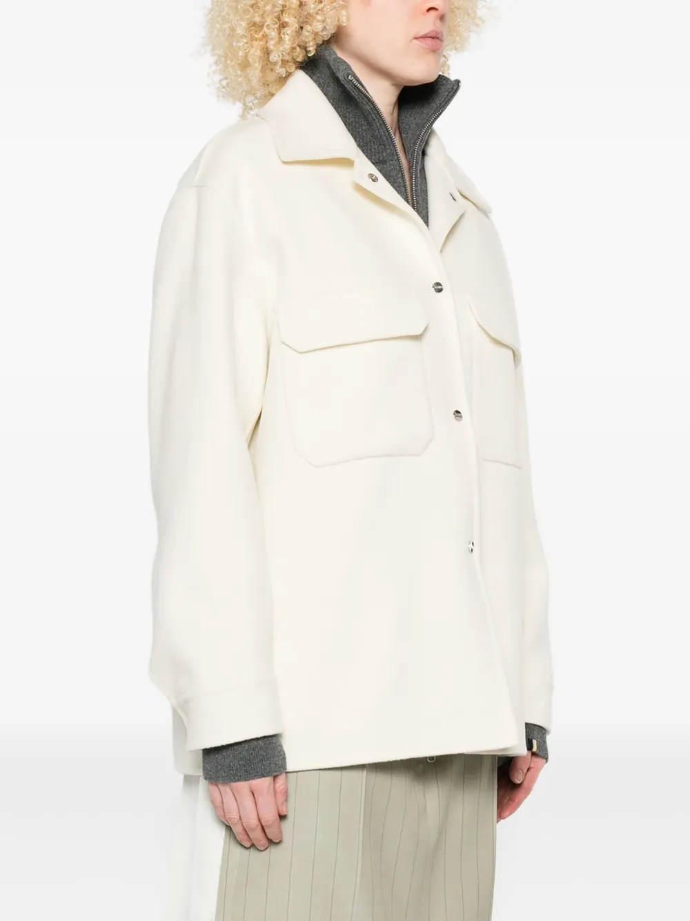 Белый шерстяной материал, застежка на пуговицы, длинные рукава, карманы с клапанами
