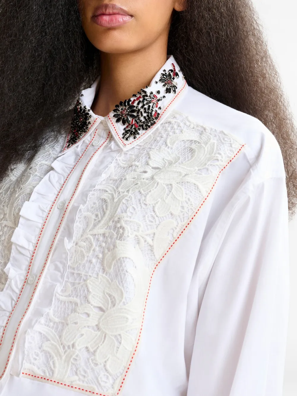 Белая кружевная панель, отделка воланами, декорированный воротник, цветочная вышивка, застежка на пуговицы
