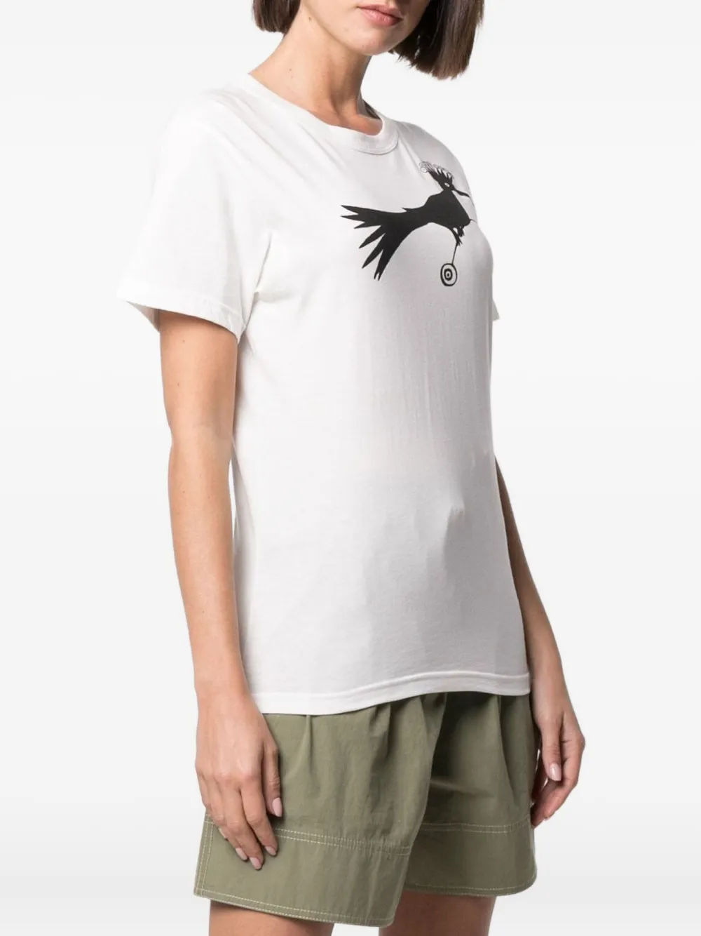 Хлопковый трикотаж с рисунком белой птицы, круглым вырезом, короткими рукавами и прямым подолом