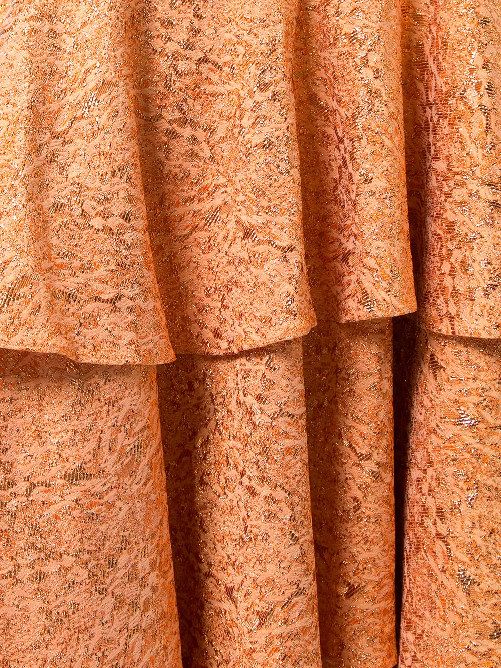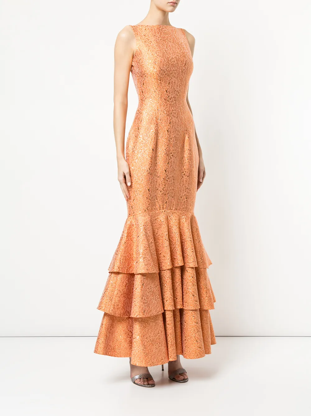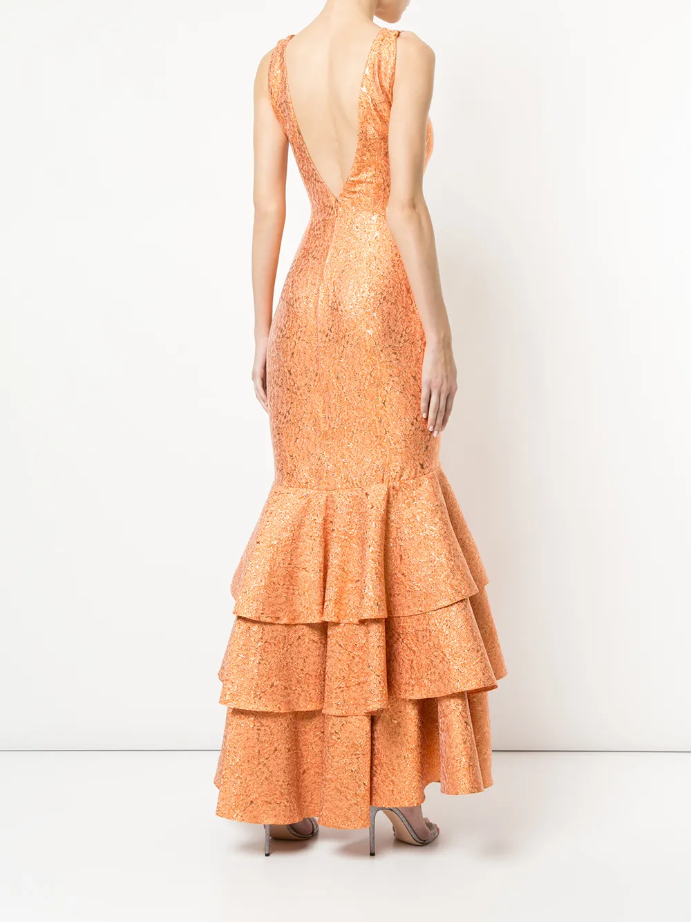Оранжевое шелковое платье с подолом с рюшами от Bambah. Вырез-лодочка, модель без рукавов, модель по фигуре, глубокий V-образный вырез на спине, потайная застежка на молнии сзади.