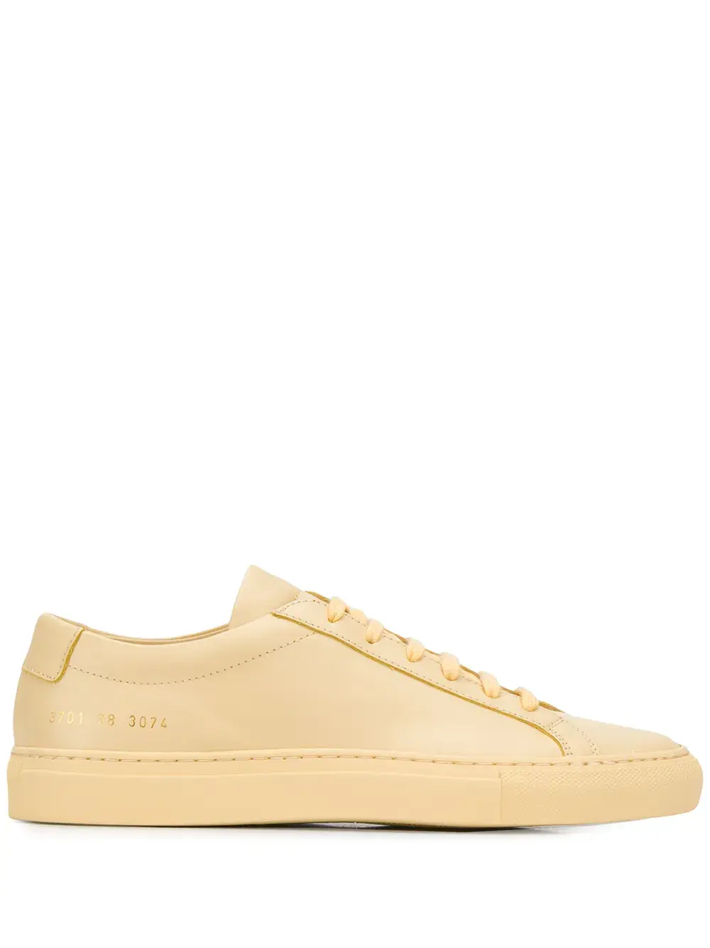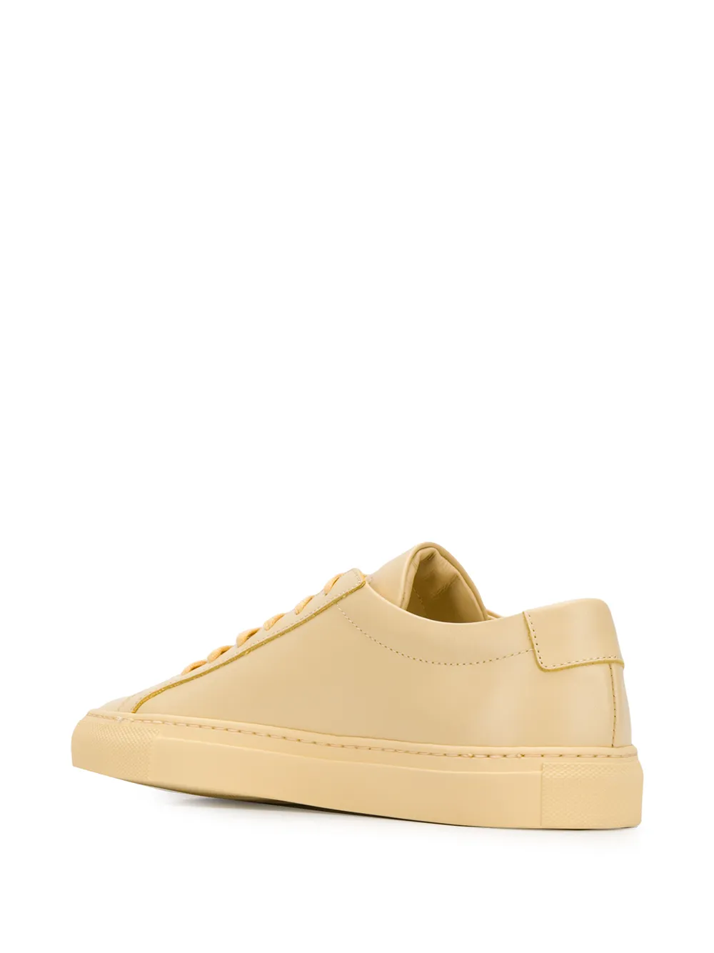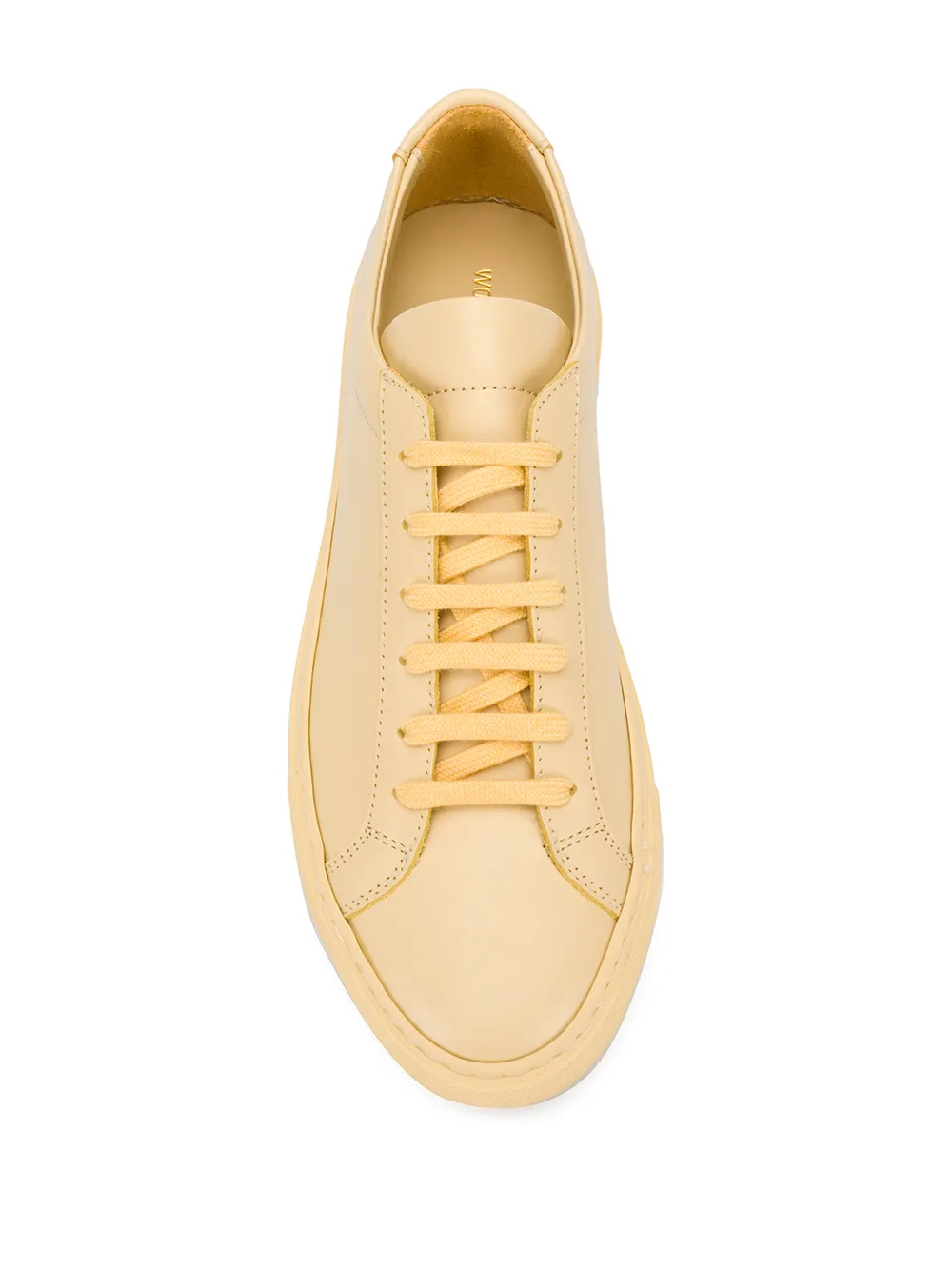 Кеды Original Achilles от Common Projects. Закругленный носок, шнуровка спереди, тисненый логотип сбоку, кожаные панели, простроченный дизайн и плоская резиновая подошва. Цвет: желтый.