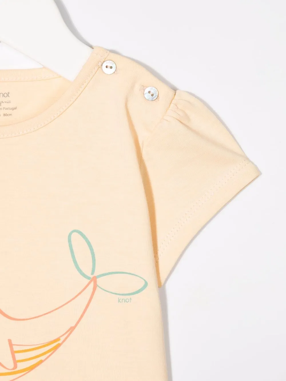 Графичный принт спереди, дизайн со сборками, круглый вырез, пуговичные застежки на плечах, короткие рукава и прямой подол.