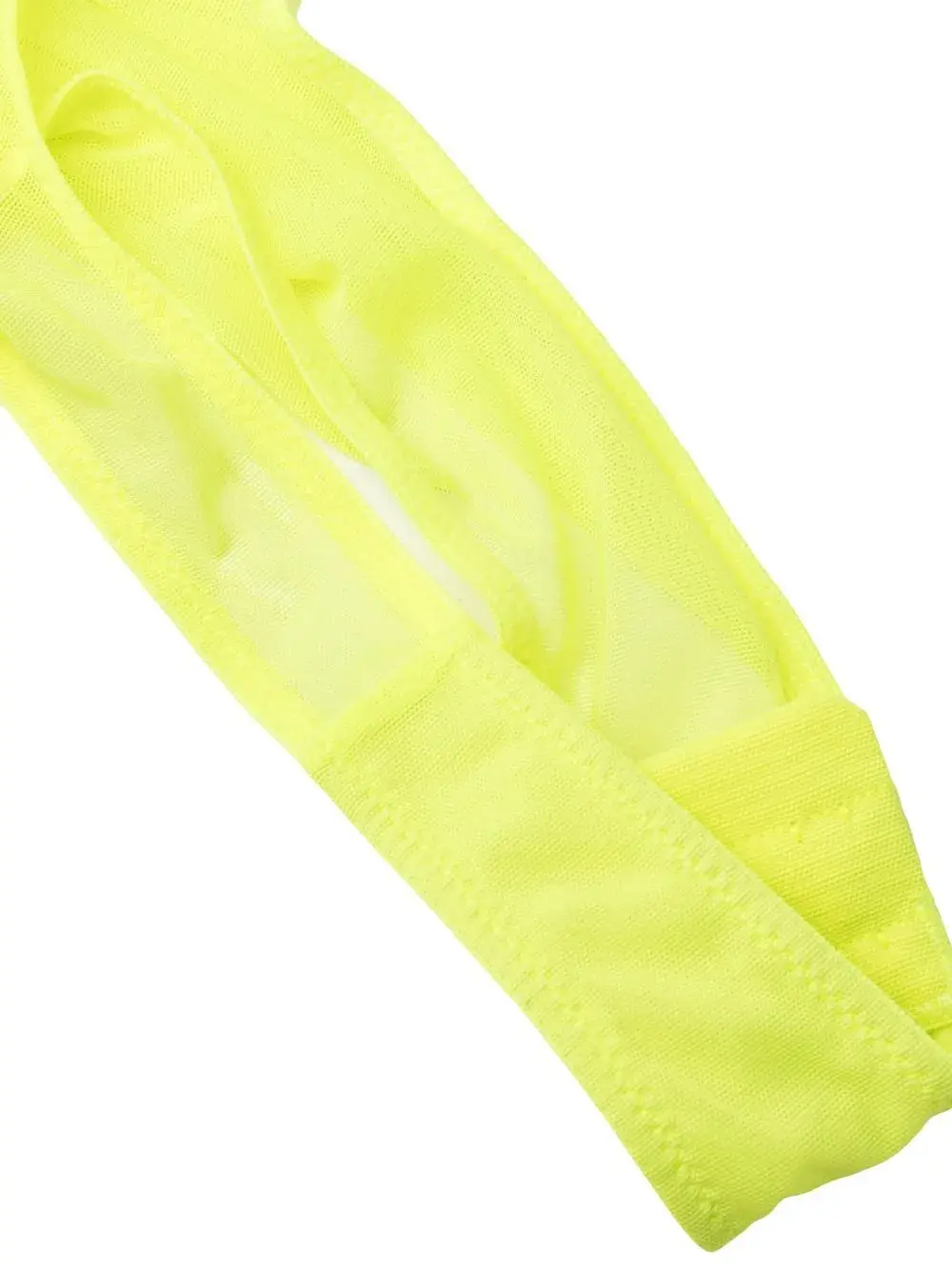 Флуоресцентный желтый, эластичный материал, прозрачное покрытие, два съемных ремня на плечо, квадратный вырез и Т-образный ремешок. Эту вещь можно примерить, но только поверх собственного белья.