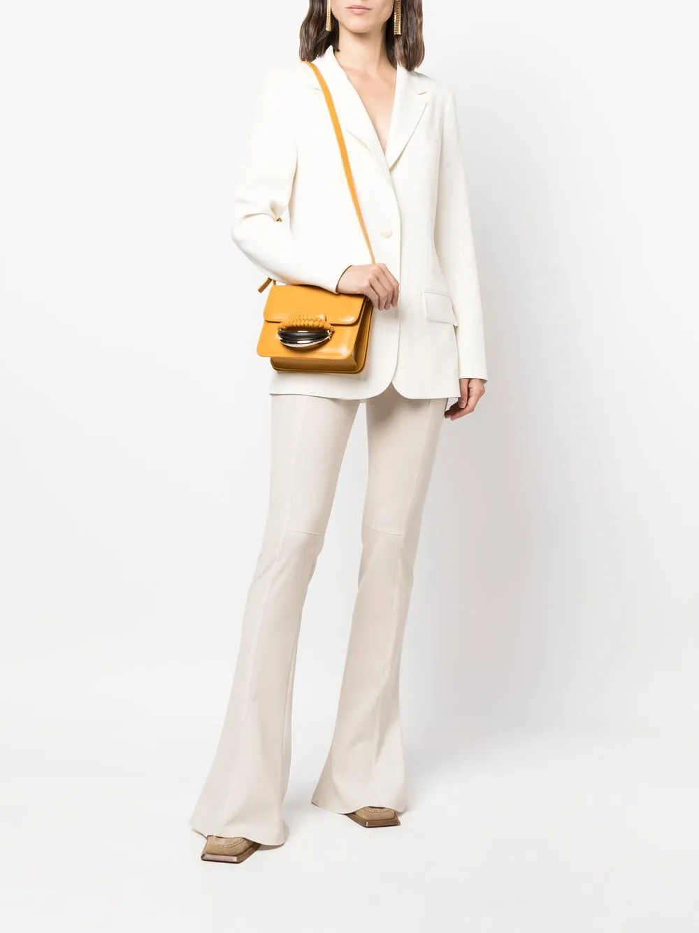 Желтый, телячья кожа, тисненый логотип спереди, серебристая фурнитура, регулируемый ремень на плечо, откидной клапан и основное отделение.