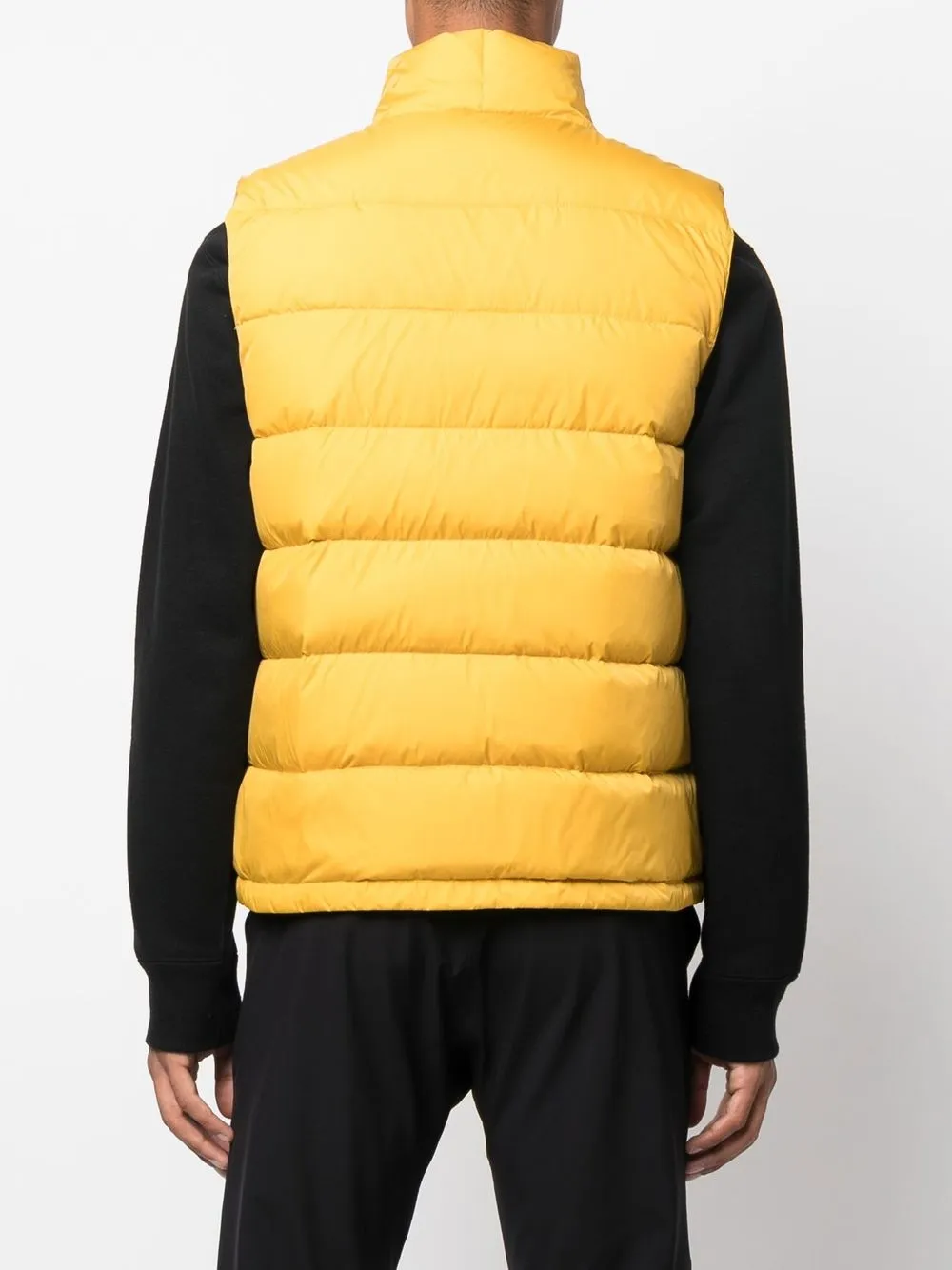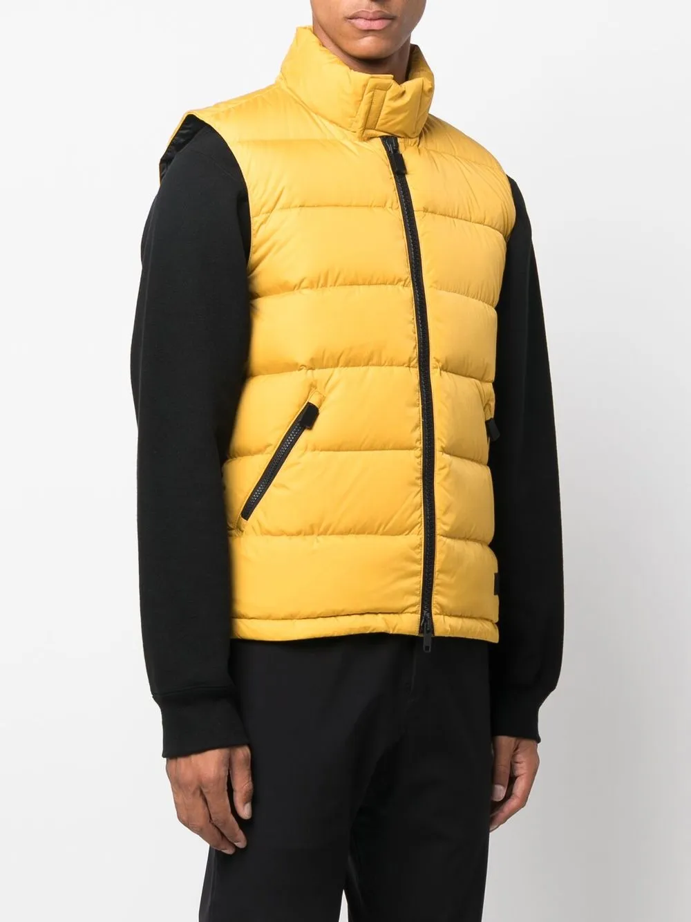 Желтый, наполнитель из смеси пуха и пера, дутый материал, нашивка с логотипом спереди, двусторонняя молния спереди, воротник-стойка, без рукавов, два кармана на молнии по бокам, подол с кулиской и прямой подол.