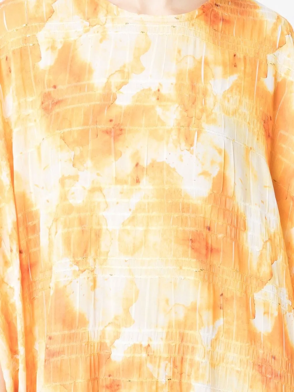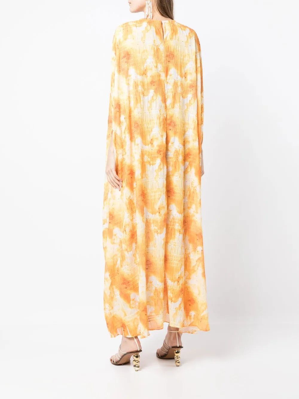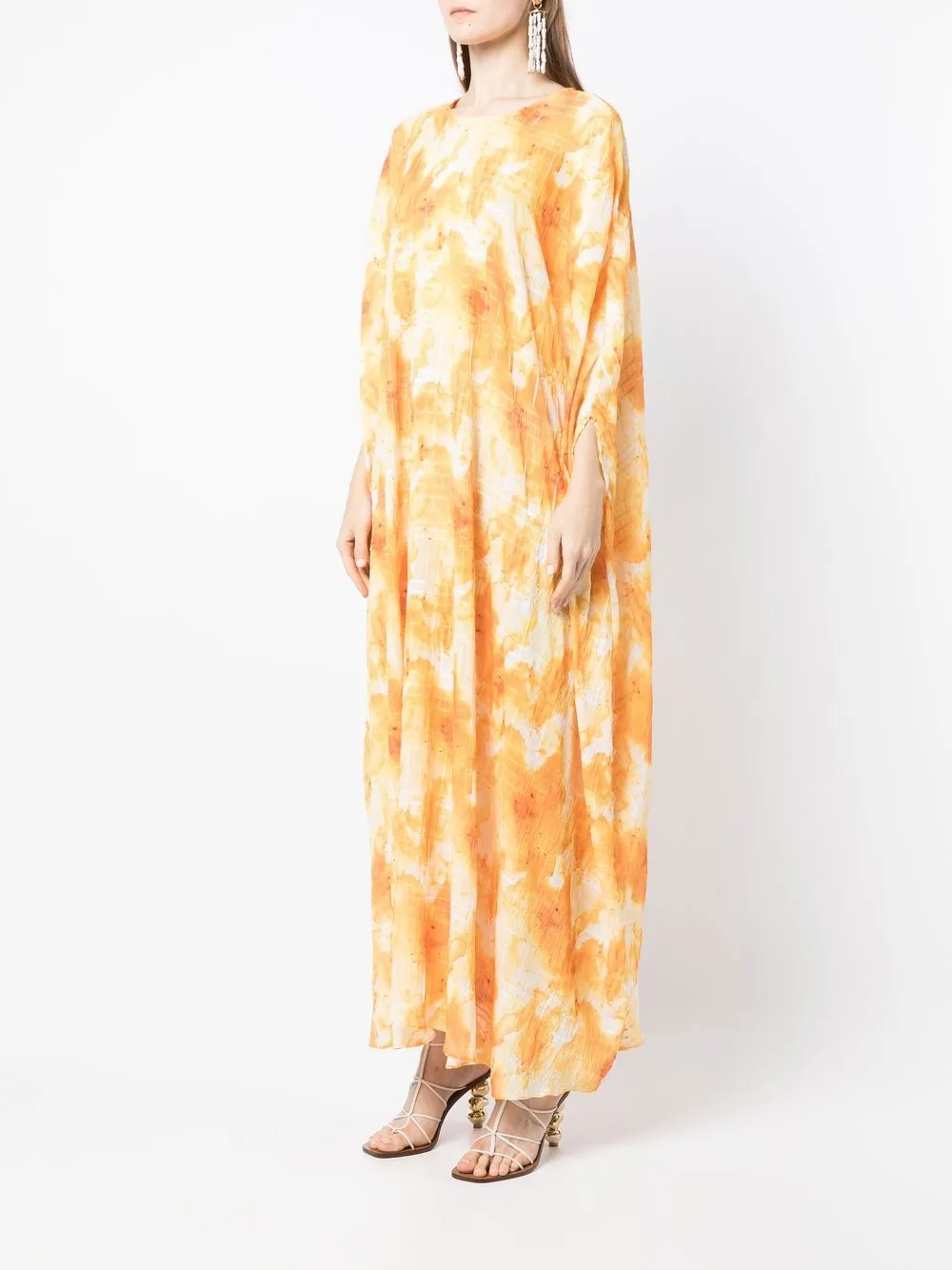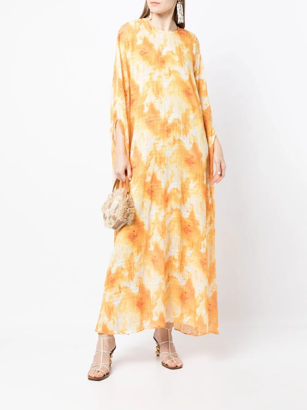 Желтый, принт тай-дай, силуэт трапеция, длина макси, круглый вырез и длинные рукава.