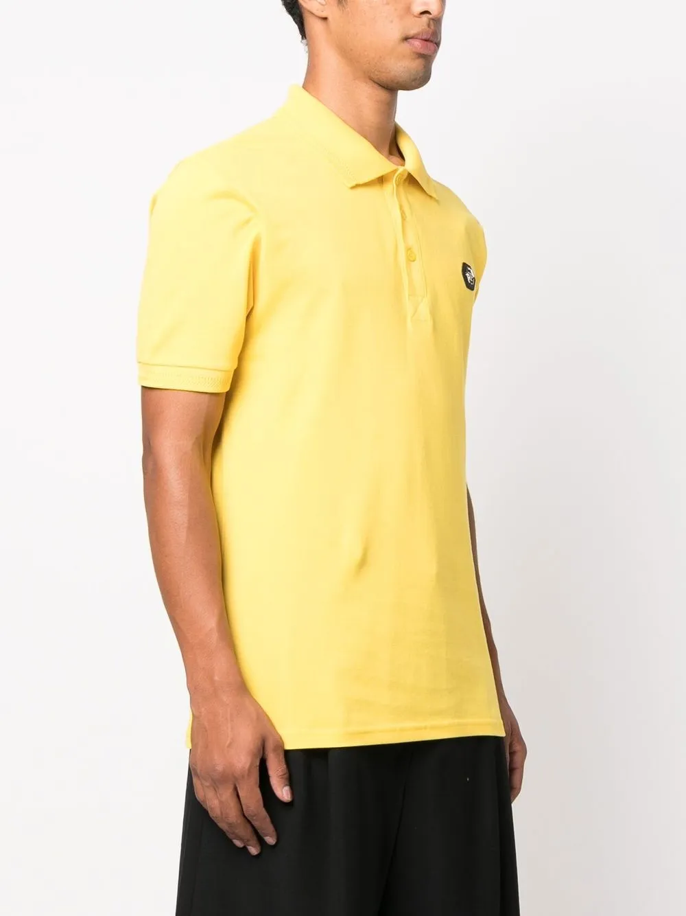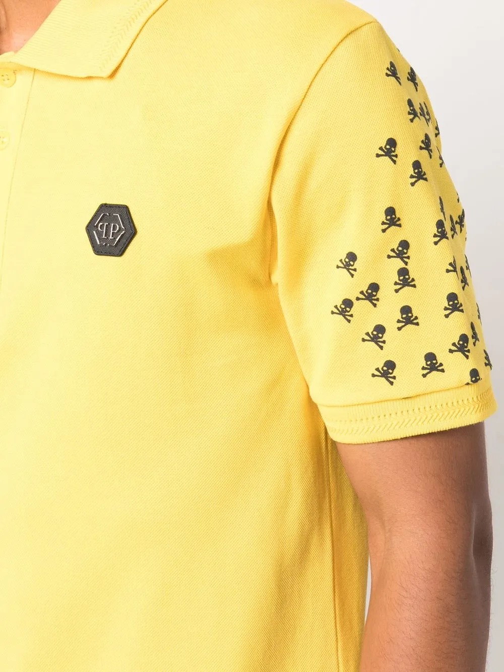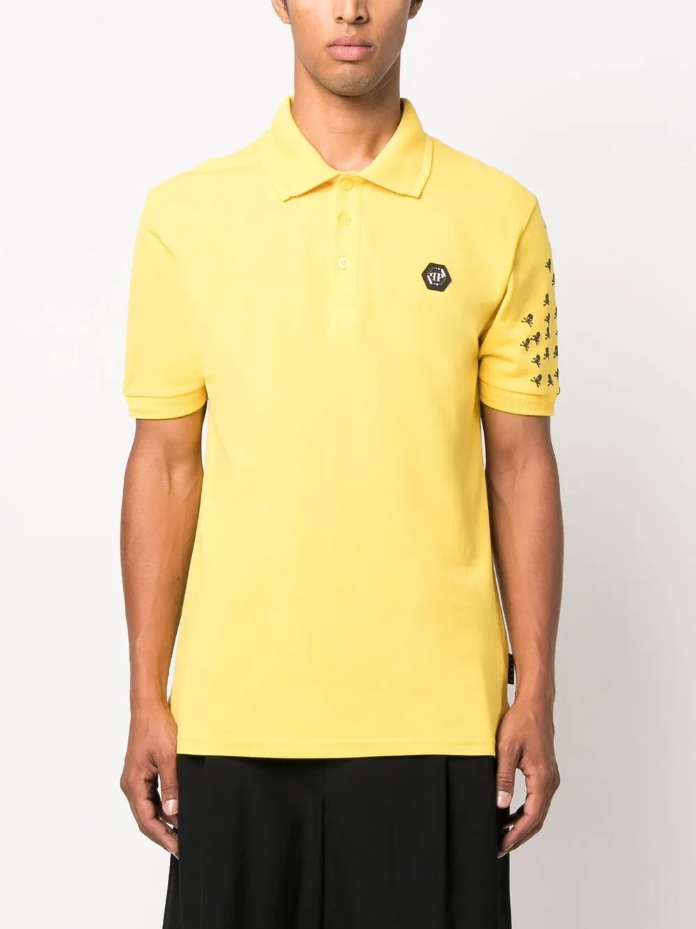 Желтый, черный, хлопок, нашивка с логотипом на груди, принт с изображением черепа спереди, принт с изображением черепа на тыльной стороне, принт с логотипом сзади, воротник поло, планка на пуговицах спереди, короткие рукава и прямой подол.
