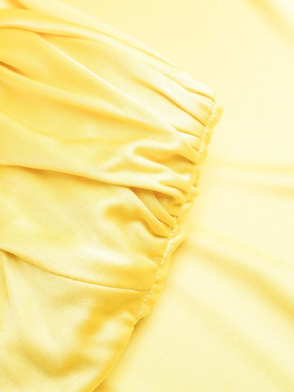 Желтый, плиссированная модель, модель на одном плече, один длинный рукав, асимметричный подол и длина до бедер.