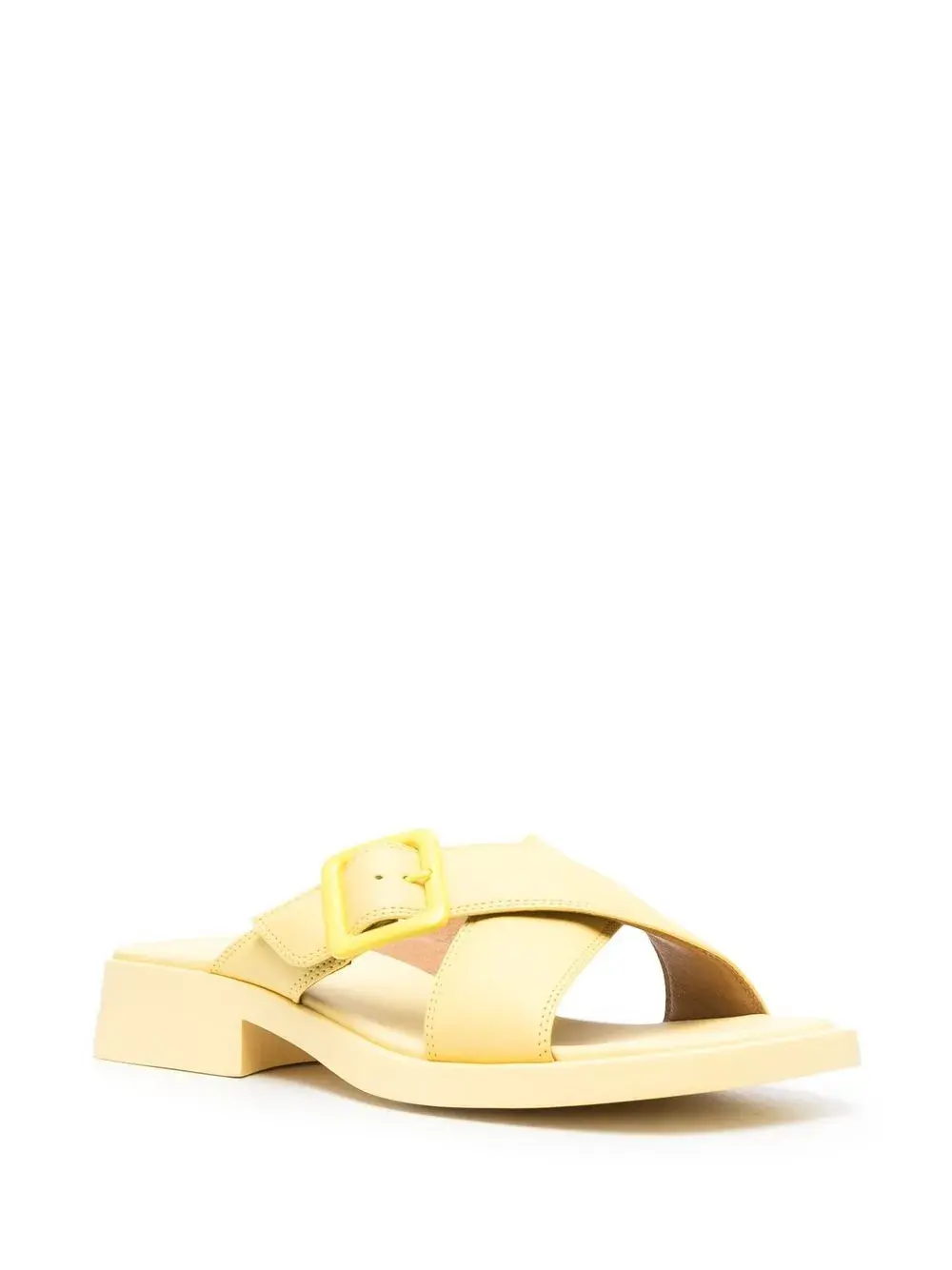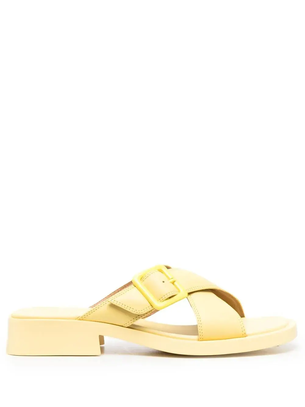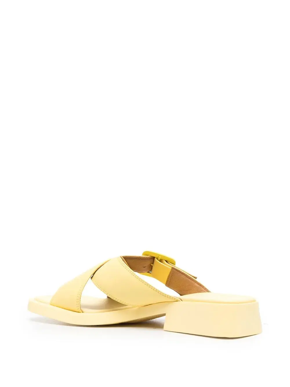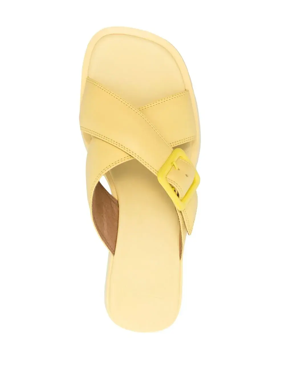 Пастельно-желтый, кожа, открытый носок, перекрестные ремешки, пряжка на носке, стелька с логотипом и низкий блочный каблук.