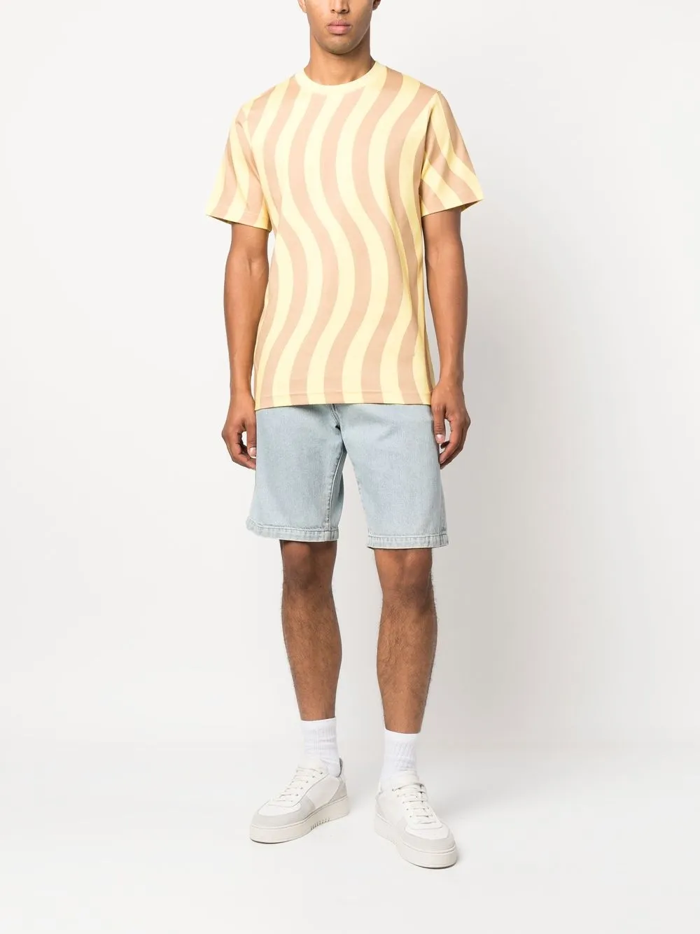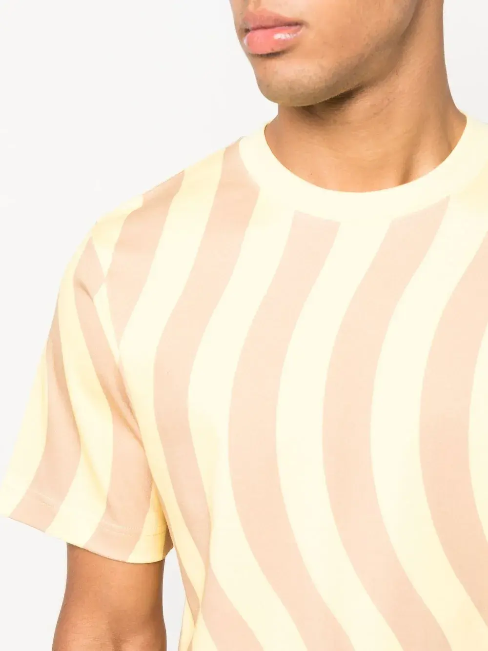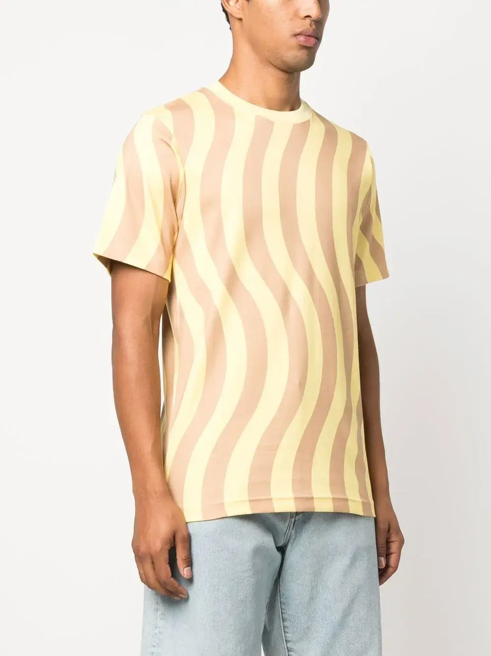 Бело-желтый, хлопок, волнистый принт, круглый вырез, короткие рукава и прямой подол. Это унисекс-модель. Обратите внимание, что для нее используется мужская размерная сетка. Узнать больше о том, какие товары получают отметку «Ответственный выбор», можно из материала «Как мы оцениваем экологичность и этичность».