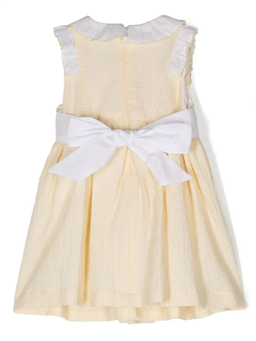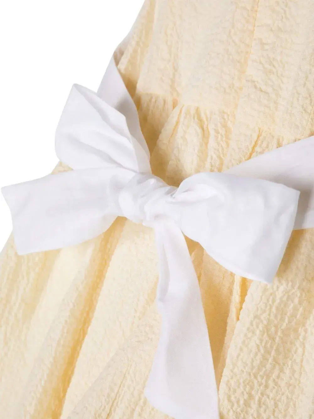 Сирсакер, гофрированный эффект, вставки с оборками, застежка на завязке сзади, круглый вырез, без рукавов, пышная юбка и прямой подол.