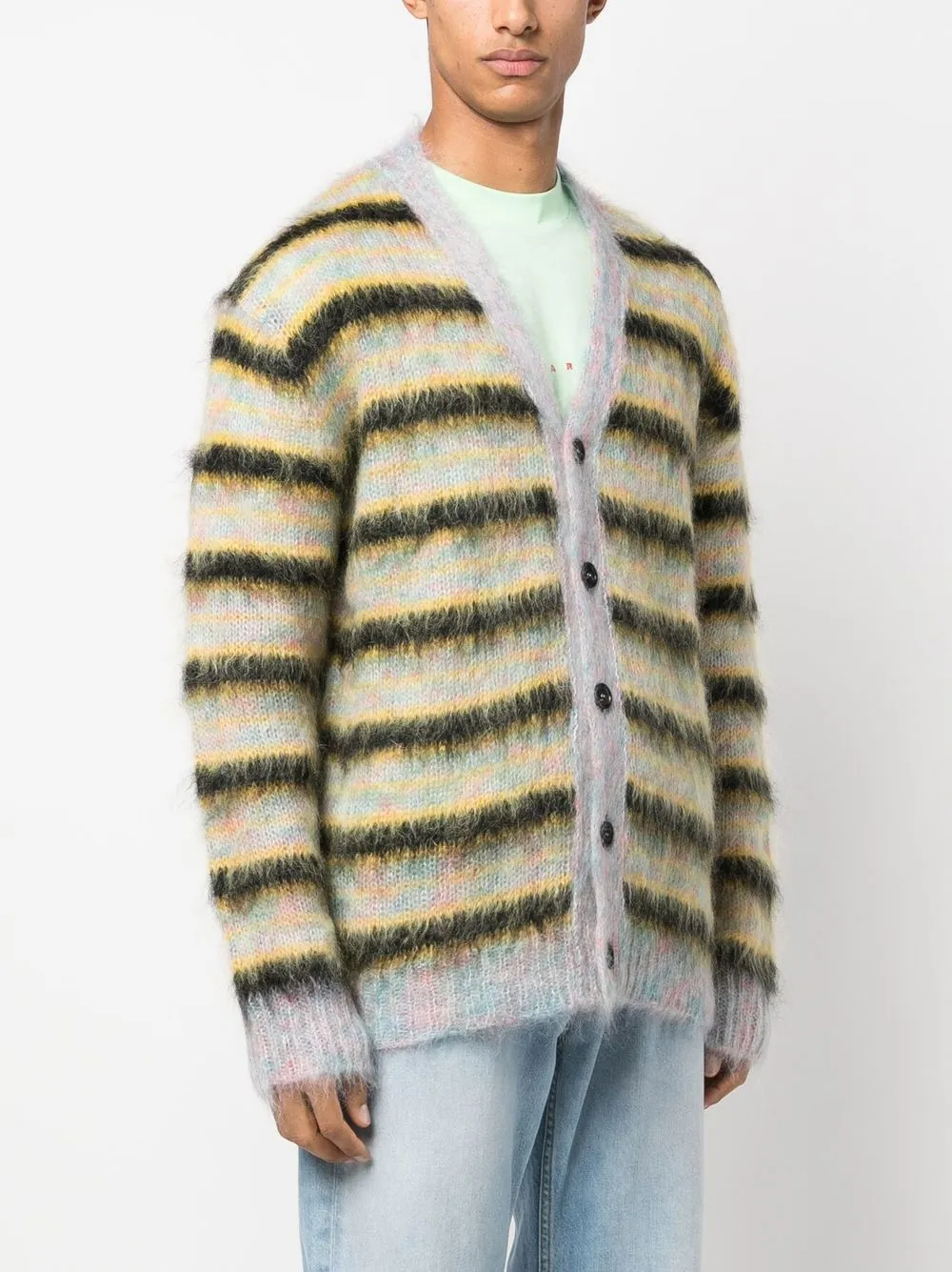 Разноцветный, смесовый мохер, матовый эффект, узор в горизонтальную полоску, застежка на пуговицах спереди, V-образный вырез и удлиненные рукава.