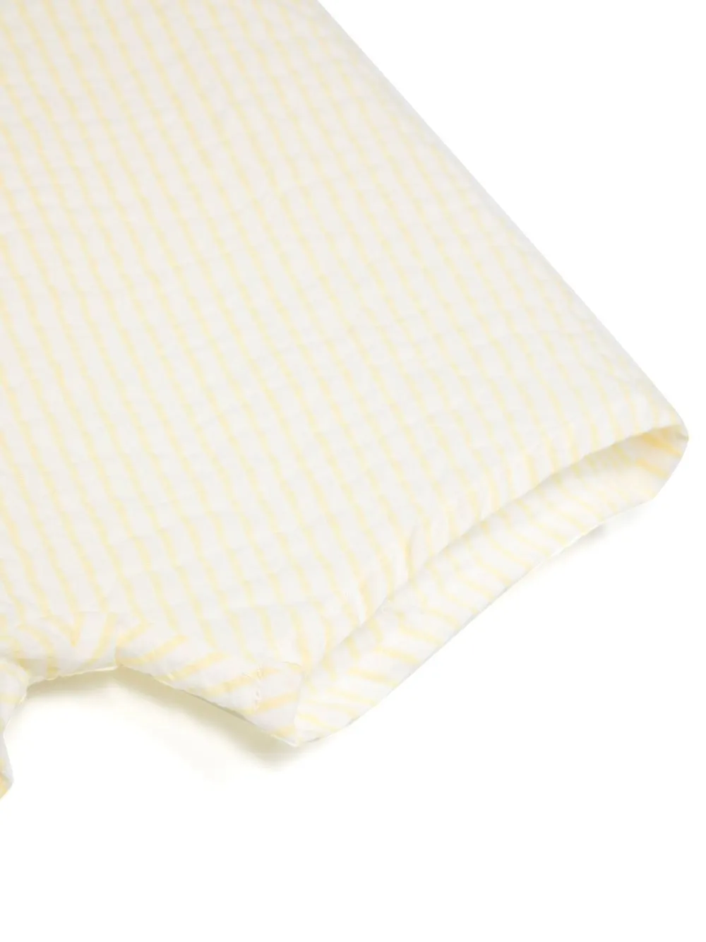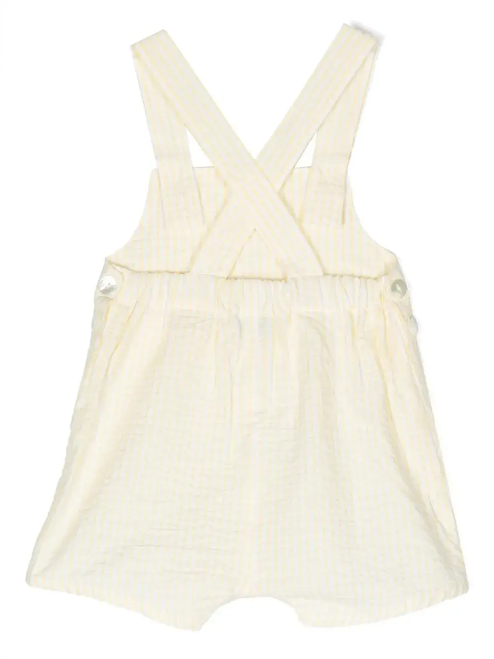 Белый, банановый, хлопок, узор в вертикальную полоску, квадратный вырез, застежка на пуговицы, перекрестные бретели на спине и без рукавов.
