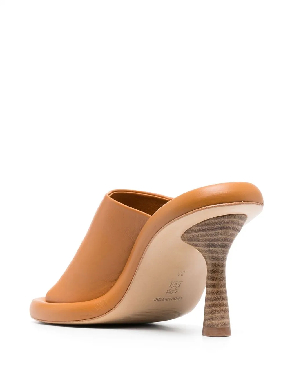 Желтая охра, телячья кожа, кожаная стелька с логотипом, открытый носок, высокий скульптурный каблук и модель без застежки.