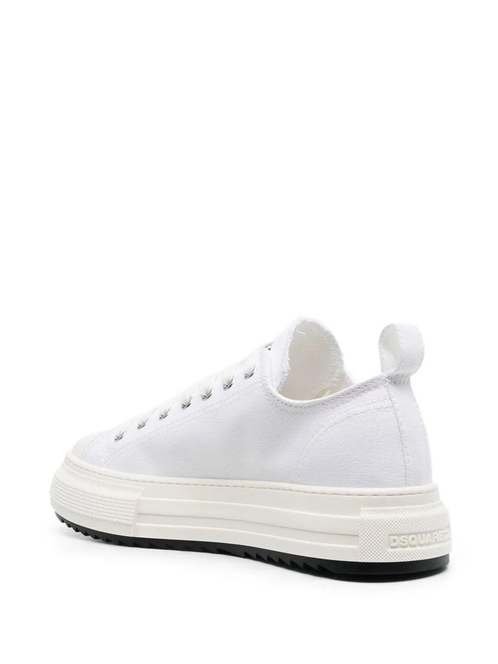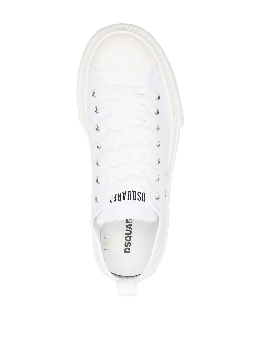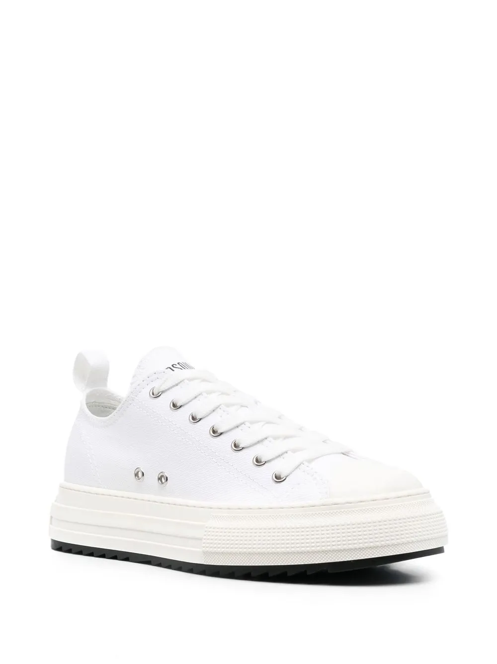 Белый, язычок с логотипом, закругленный носок, шнуровка спереди и плоская платформа.