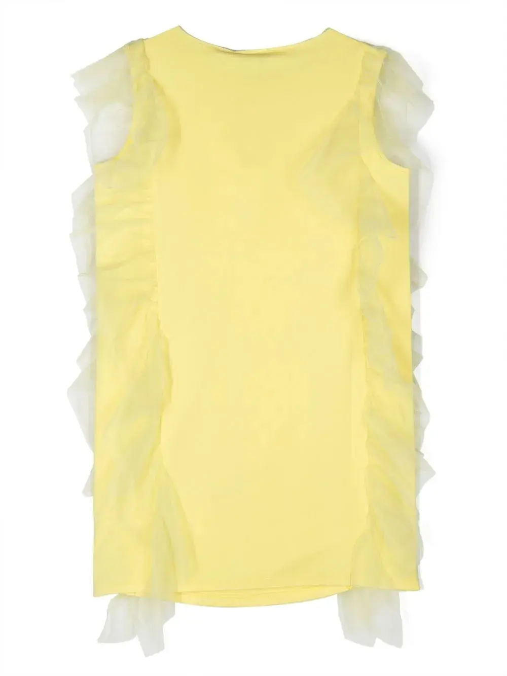 Лимонный, эластичный хлопок, верхний слой из тюля, детали с оборками, круглый вырез и без рукавов.