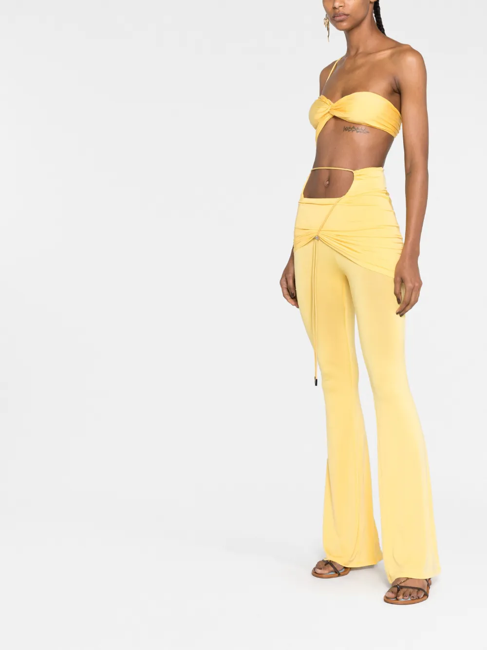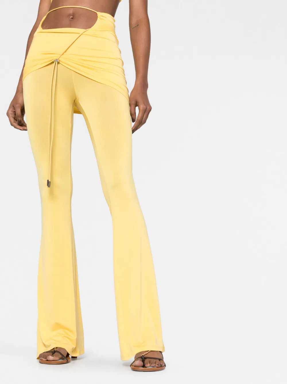 Канареечный, эластичный материал, двухслойный материал, драпировка, завышенная талия, кулиска на талии, эластичные резинки, декоративные кисточки и расклешенный подол.