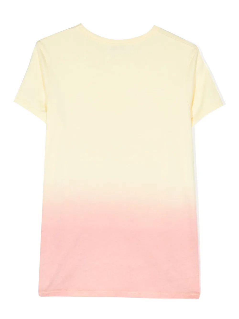 Бело-желтый, расцветка Blush Pink, хлопок, эффект омбре, логотип спереди, круглый вырез, короткие рукава и прямой подол.