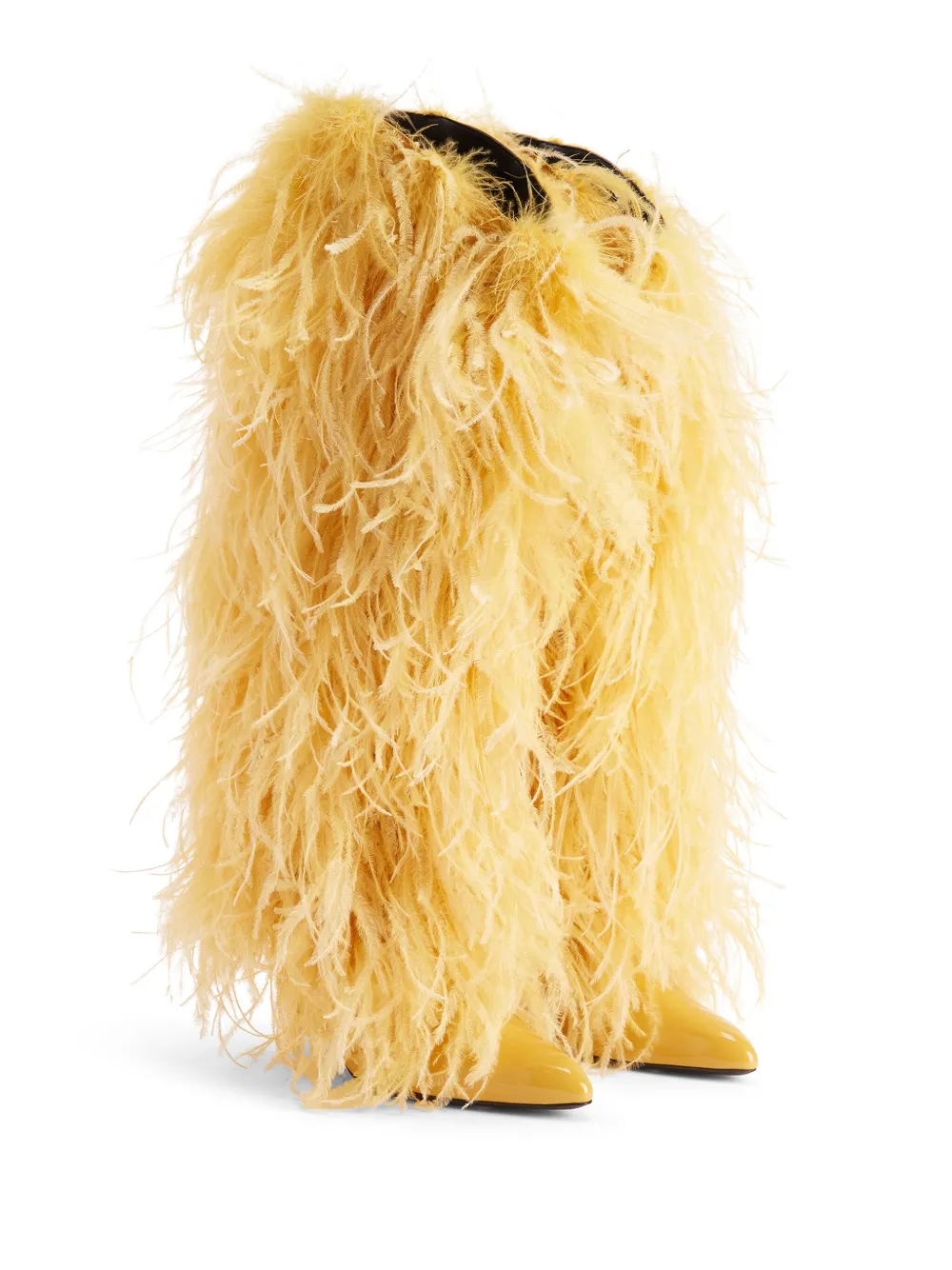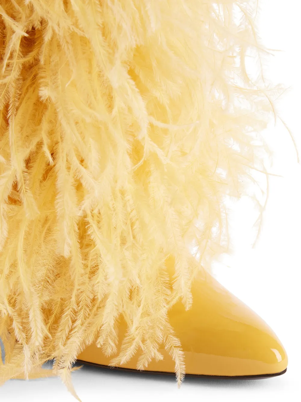 Горчично-желтый, кожа, сатиновая фактура, многослойная деталь, перья, заостренный носок, модель без застежки и каблук на высокой шпильке.