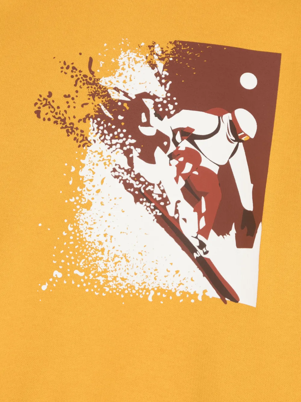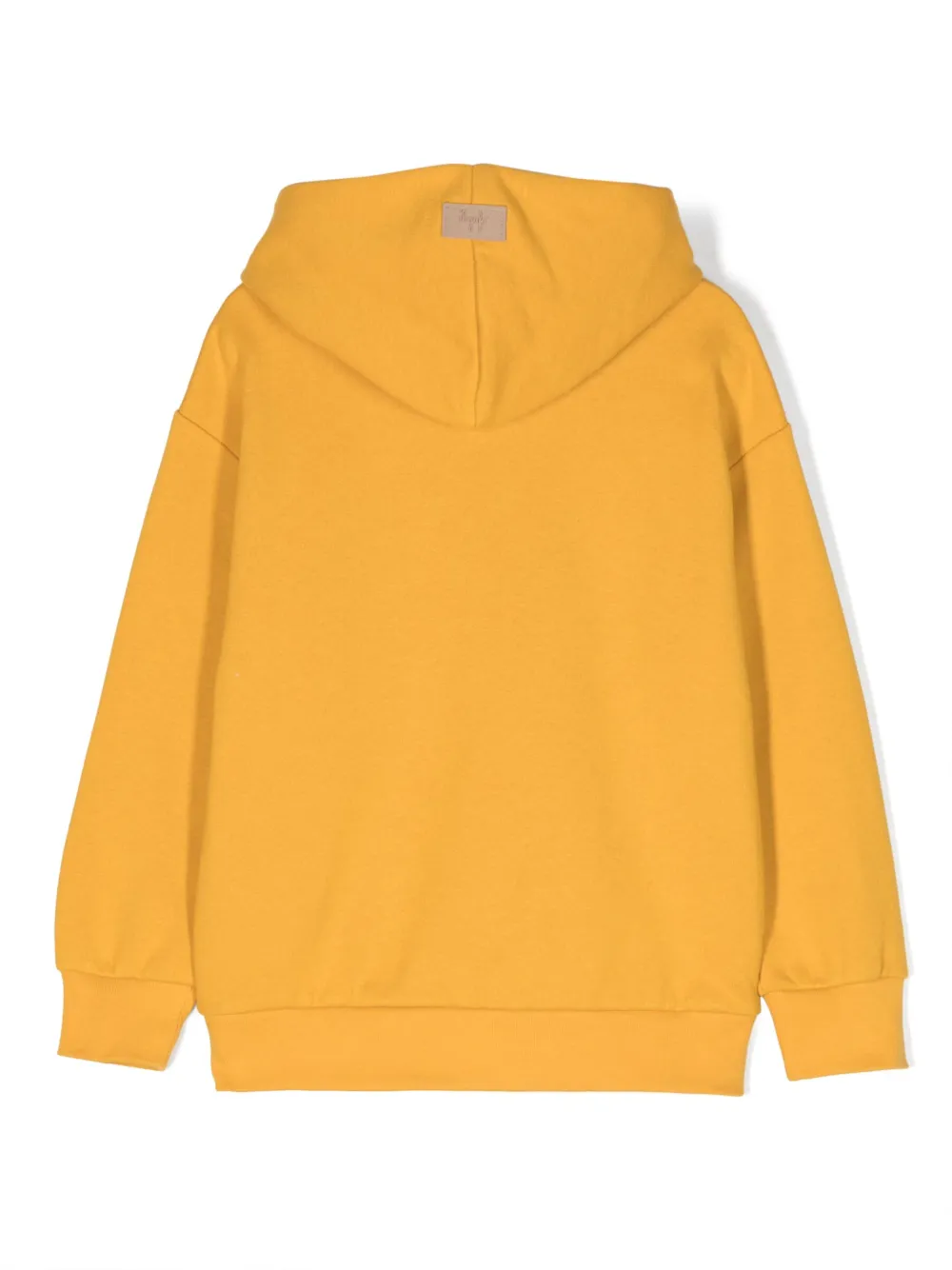 Горчично-желтый, хлопок, графичный принт спереди, классический капюшон, длинные рукава и прямой подол.