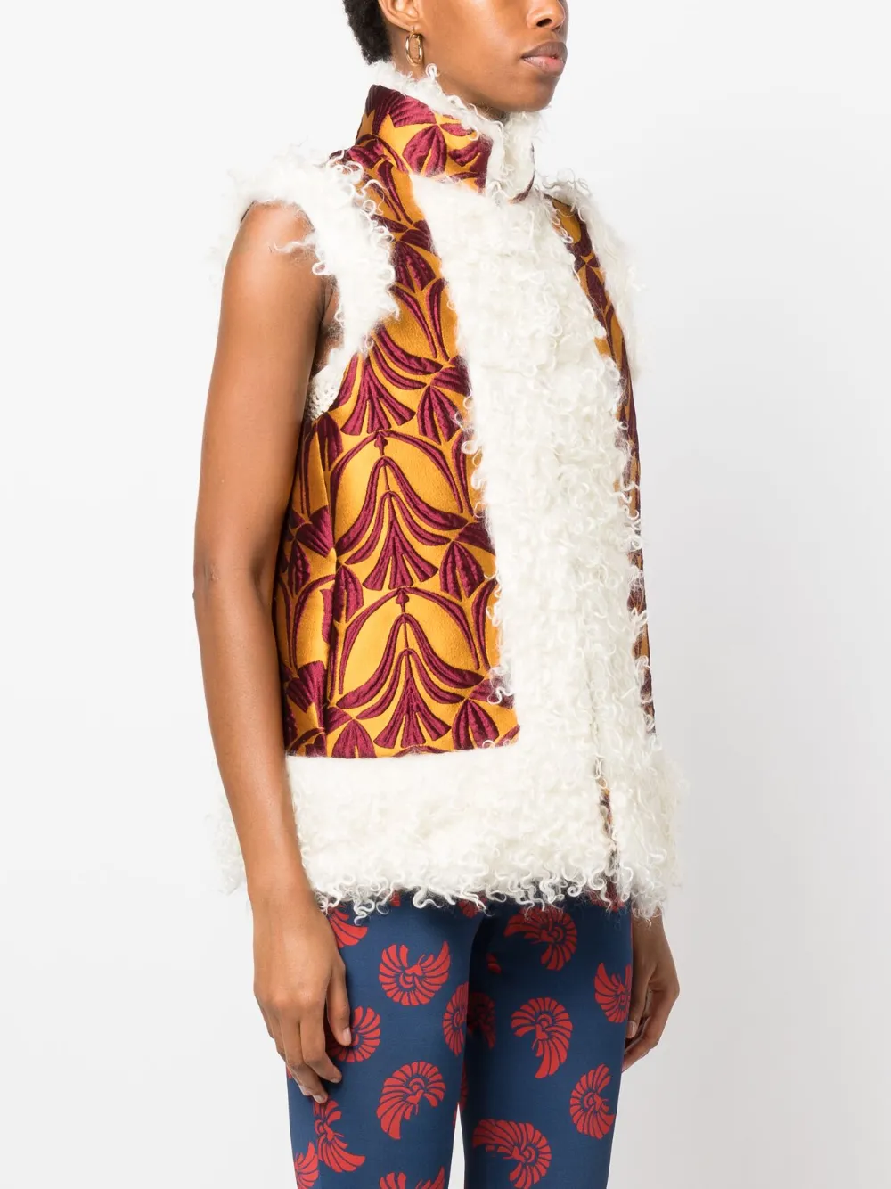 Золотистый, бордовый, цвет слоновой кости, парчовая ткань, отделка из искусственной овчины, воротник-труба, потайная застежка спереди, без рукавов, два прорезных кармана по бокам и прямой подол.