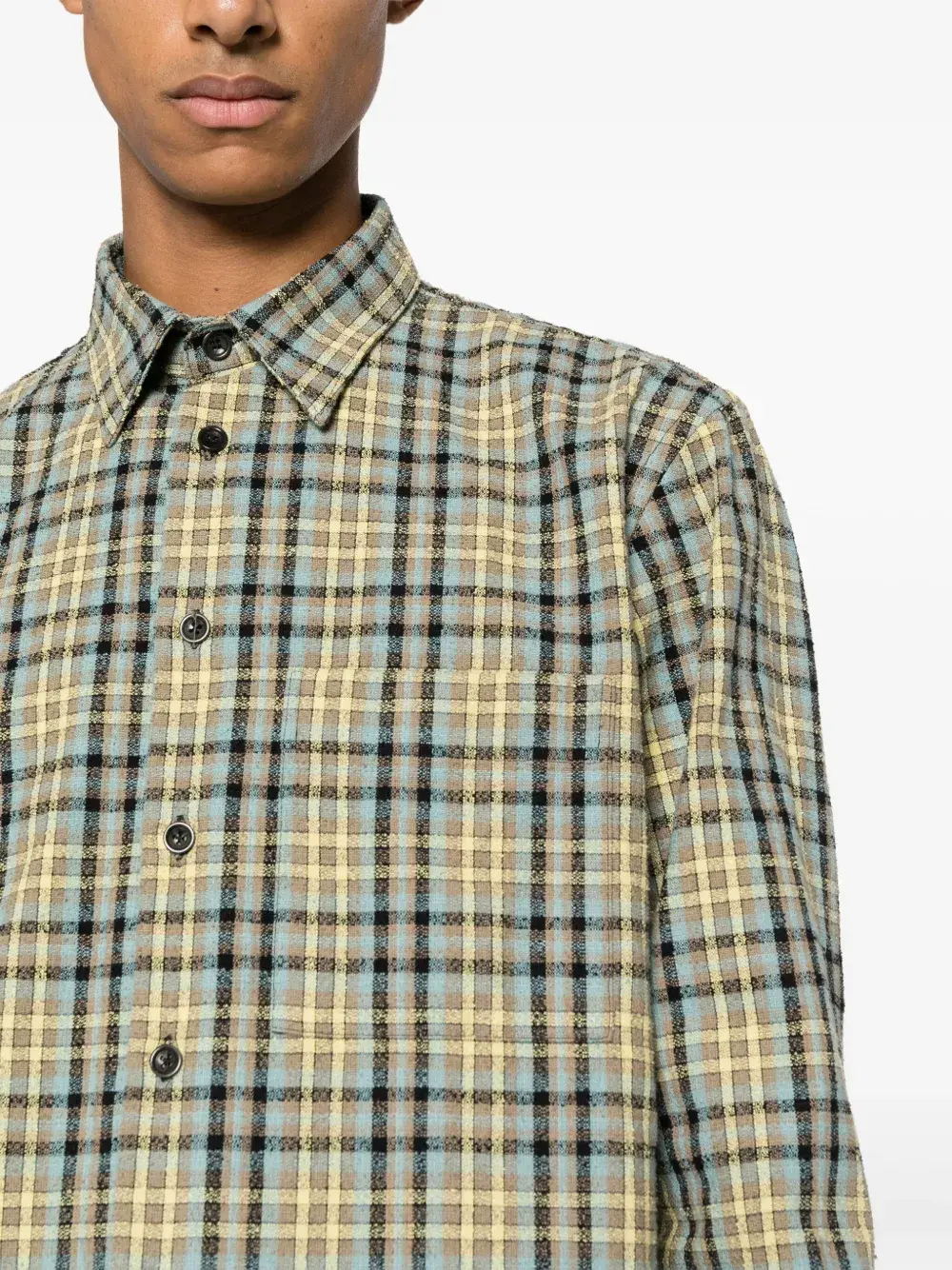 Ярко-желтый, темно-синий, смесовый хлопок, клетчатый узор, классический воротник, застежка на пуговицах спереди, длинные рукава, рукава с манжетами на пуговицах и закругленный подол.