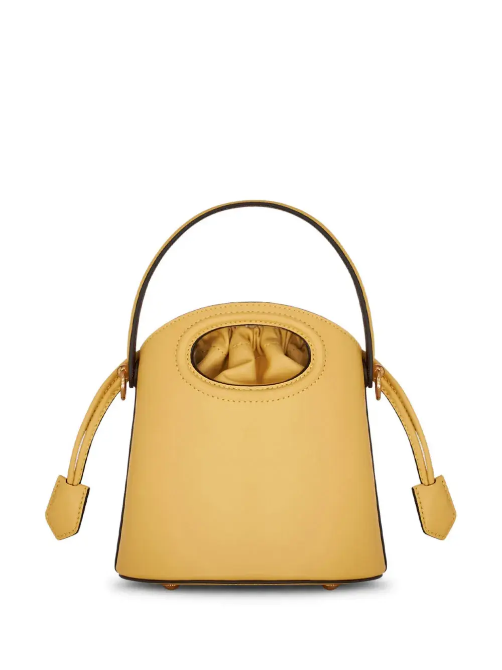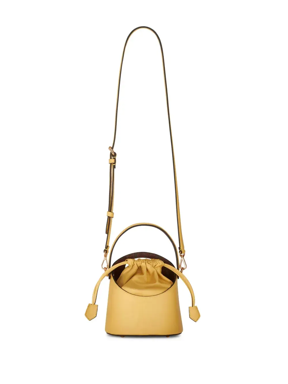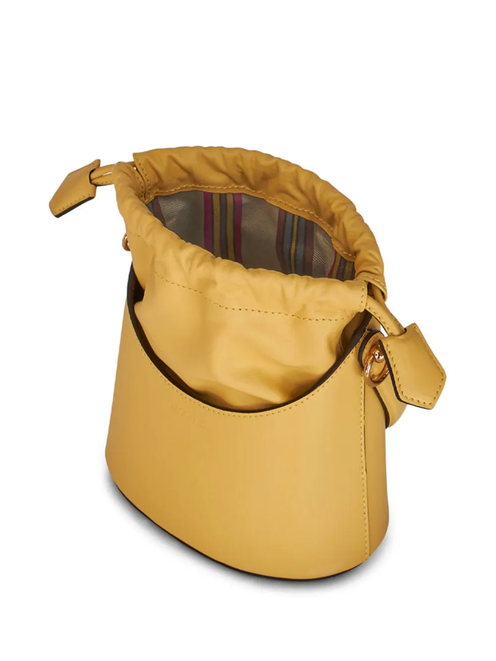 Горчично-желтый, кожа, золотистая фурнитура, тисненый логотип спереди, принт пейсли, модель ведро, верхняя застежка на шнурке, регулируемый ремень на плечо, верхняя ручка, верхняя ручка, основное отделение, нашивка с логотипом внутри, внутренние накладные карманы и металлические ножки.