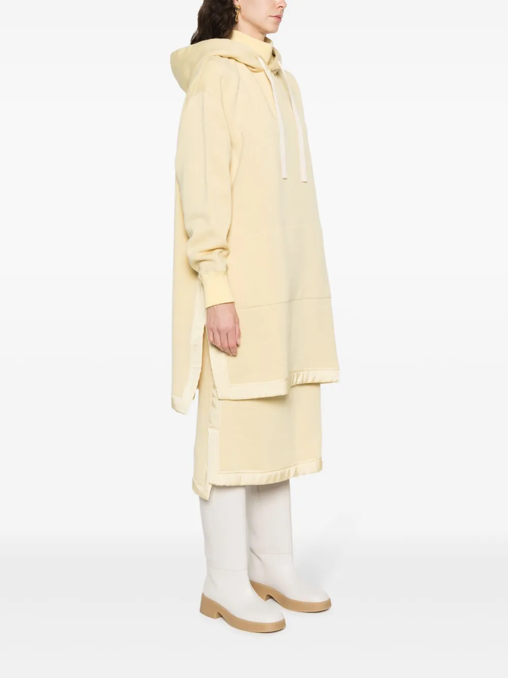 Светло-желтый, смесовая необработанная шерсть, трикотажный материал, затягивающийся на шнурок капюшон, длинные рукава, боковые разрезы и прямой подол.