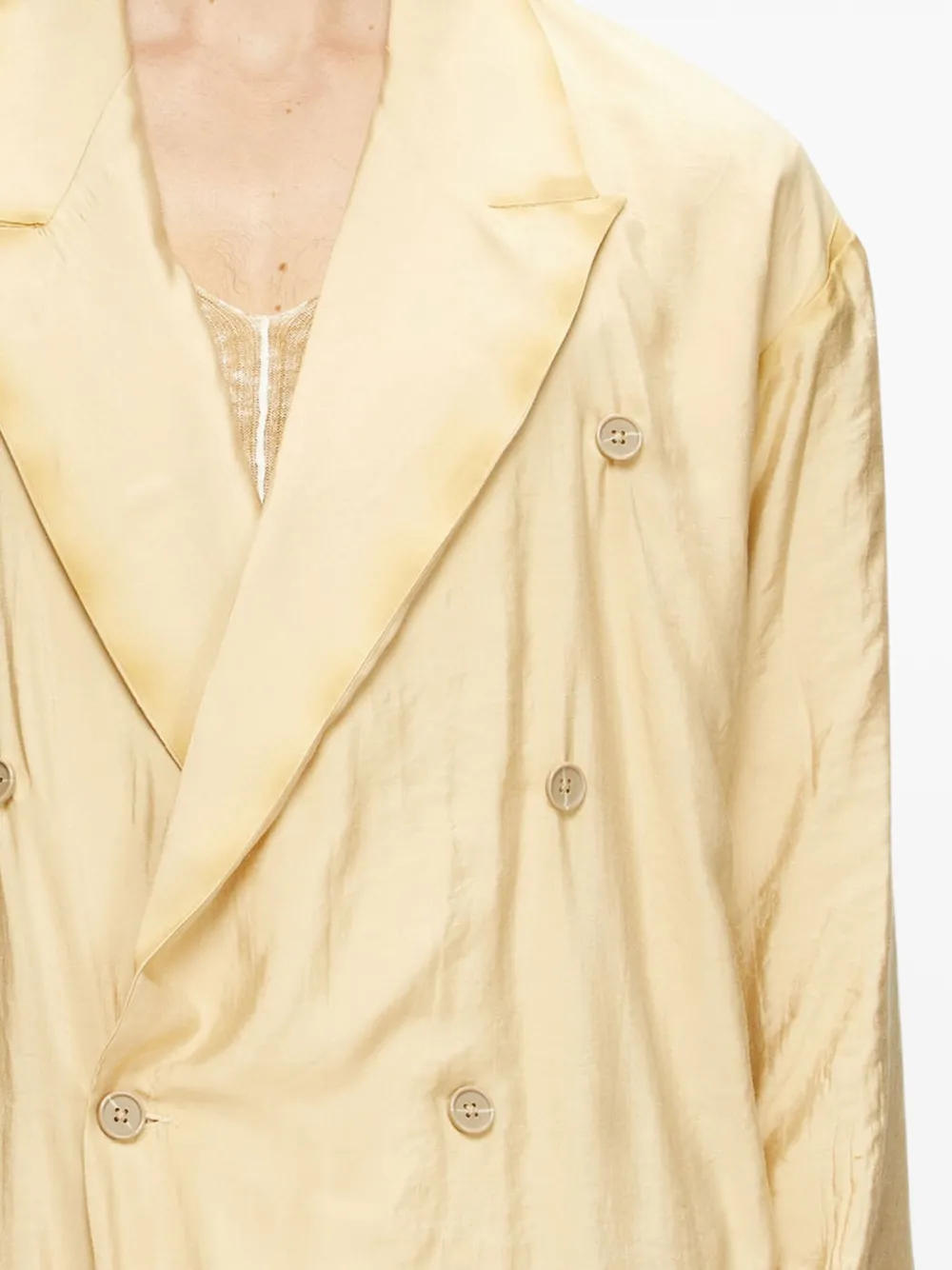 Желтая двубортная застежка, отложной воротник, длинные рукава, неровный подол