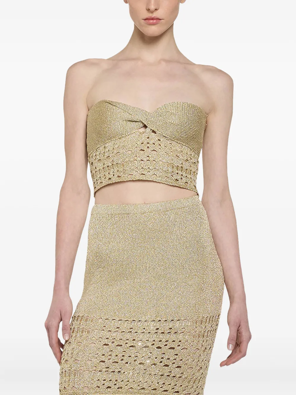 Золотистый металлик, вязаный крючком, с закрученным спереди дизайном, без бретелек, облегающий