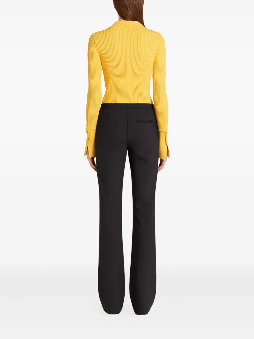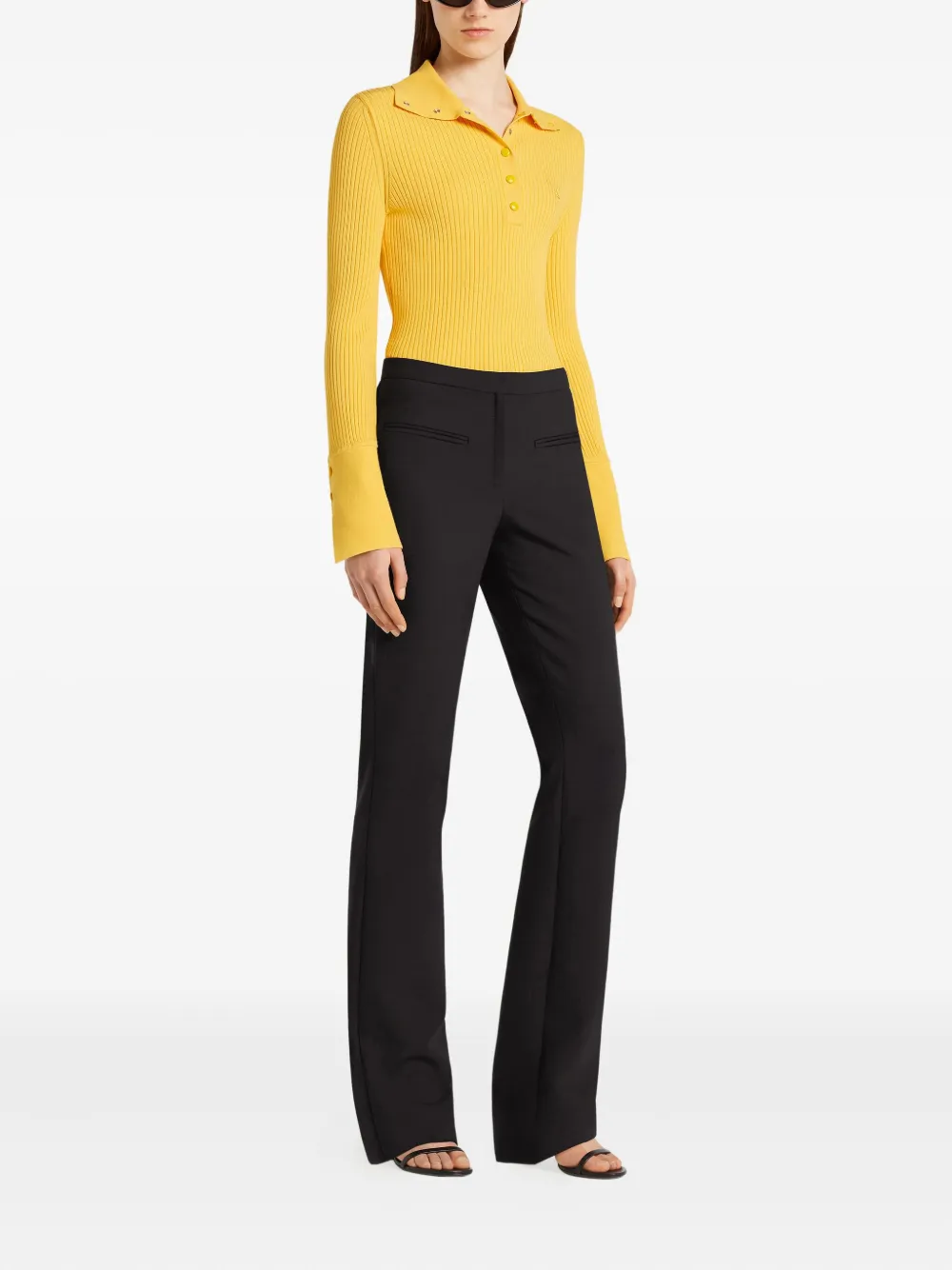 Желтая планка с пуговицами, заостренный воротник, длинные рукава, разрезные манжеты
